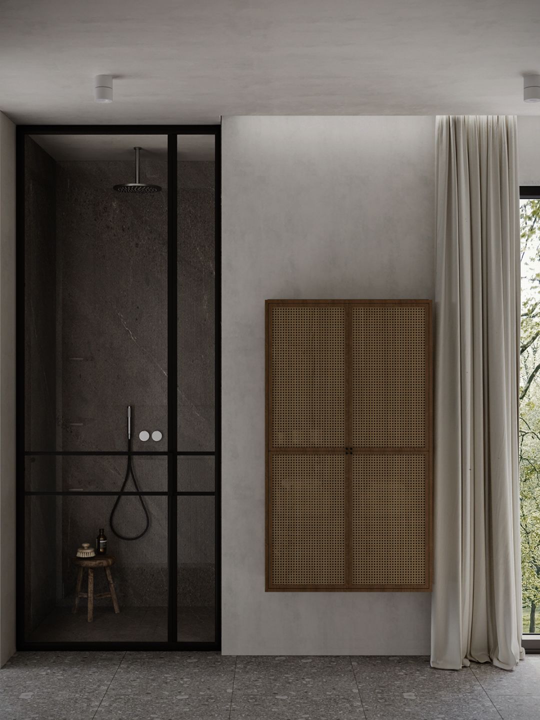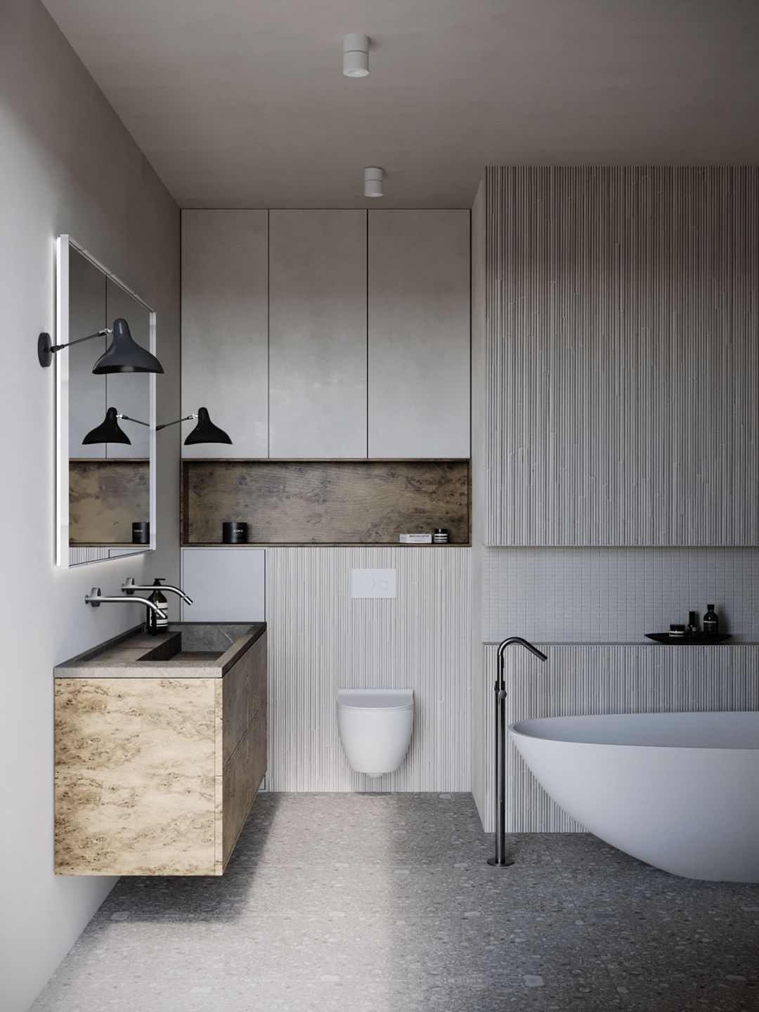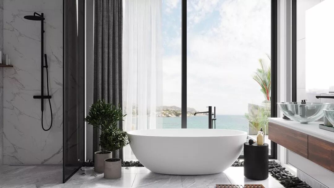 卫生间,灰色大理石凸显自然质感,简约的设计搭配落地窗, 时尚不失艺术感 。