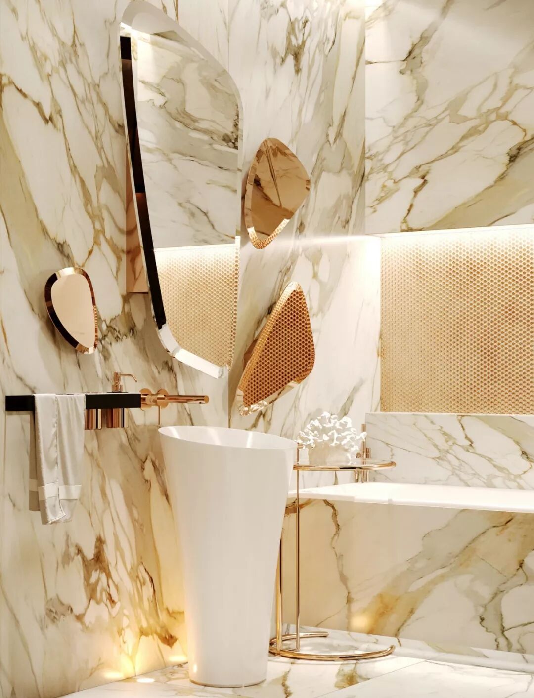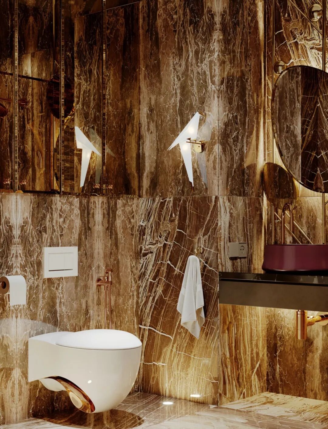 设计使用了大量金属、玻璃、大理石等材料, 现代工艺与古典元素糅合,轻奢质感与复古气息并驾齐驱。