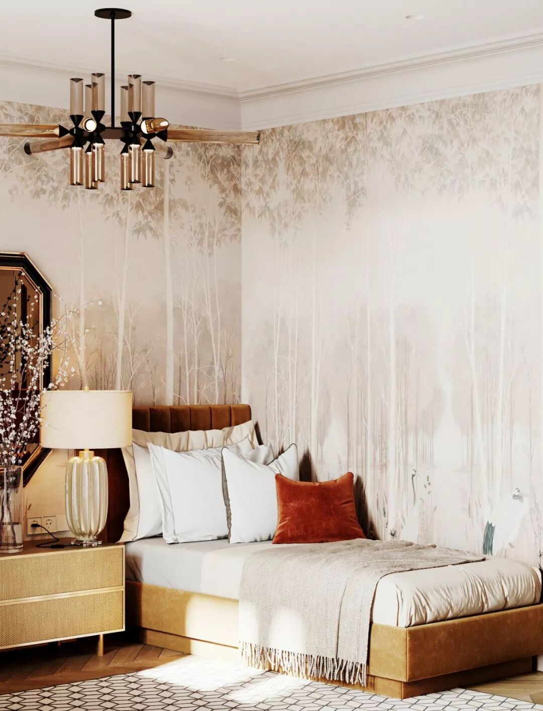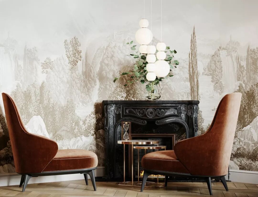 次卧的风景壁纸与客厅墙面相呼应,令整居氛围更加整体。吊灯的设计精致现代,为复古空间带来轻奢气质 。