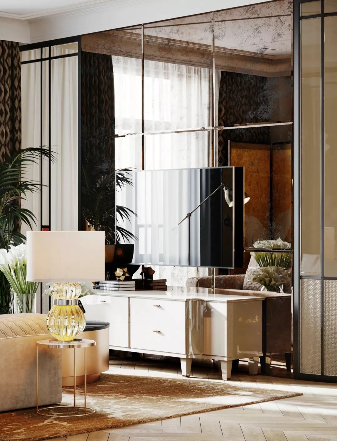 室内的陈设,现代材质演绎经典造型,古今交融碰撞出极致的高级质感 。