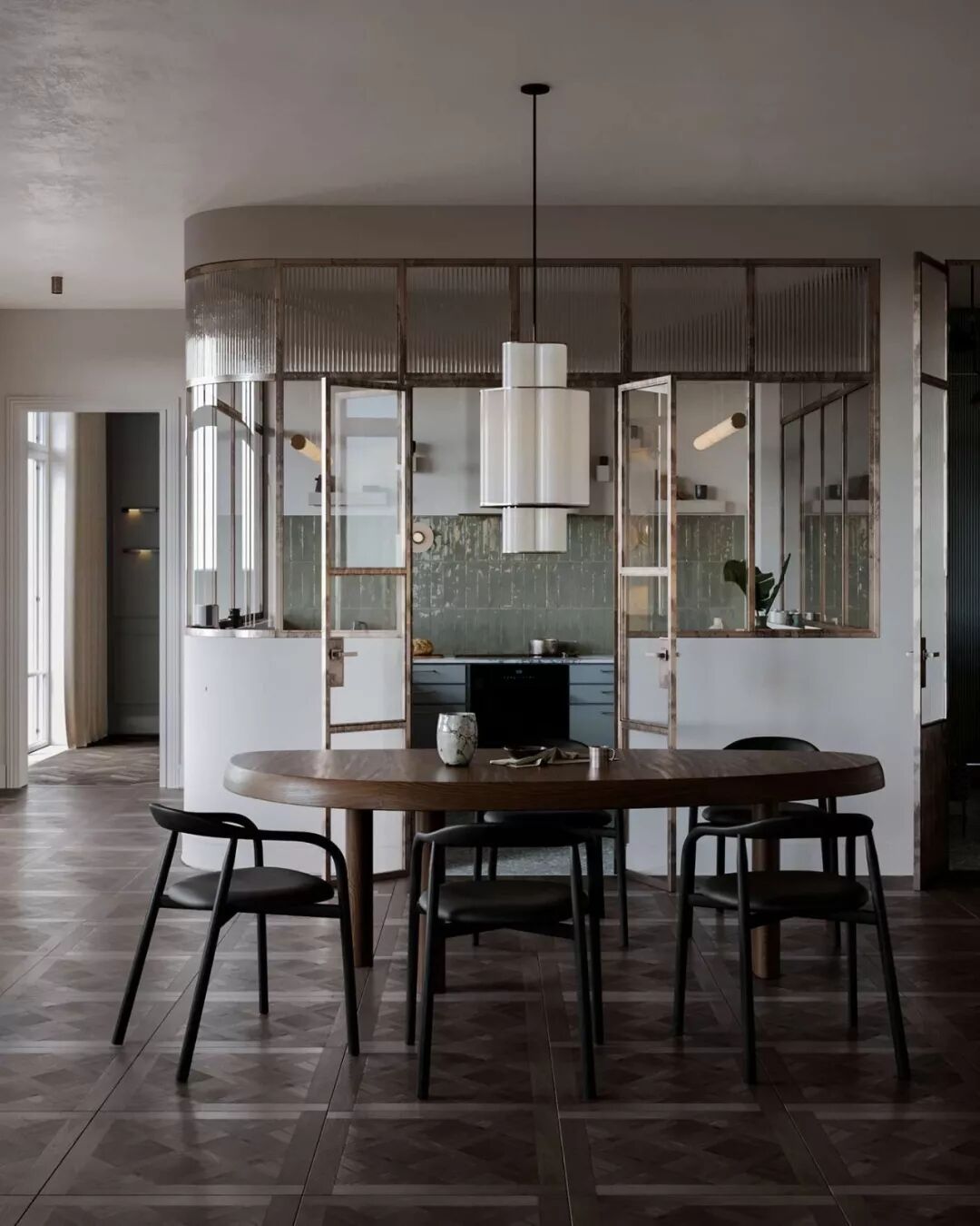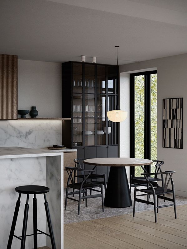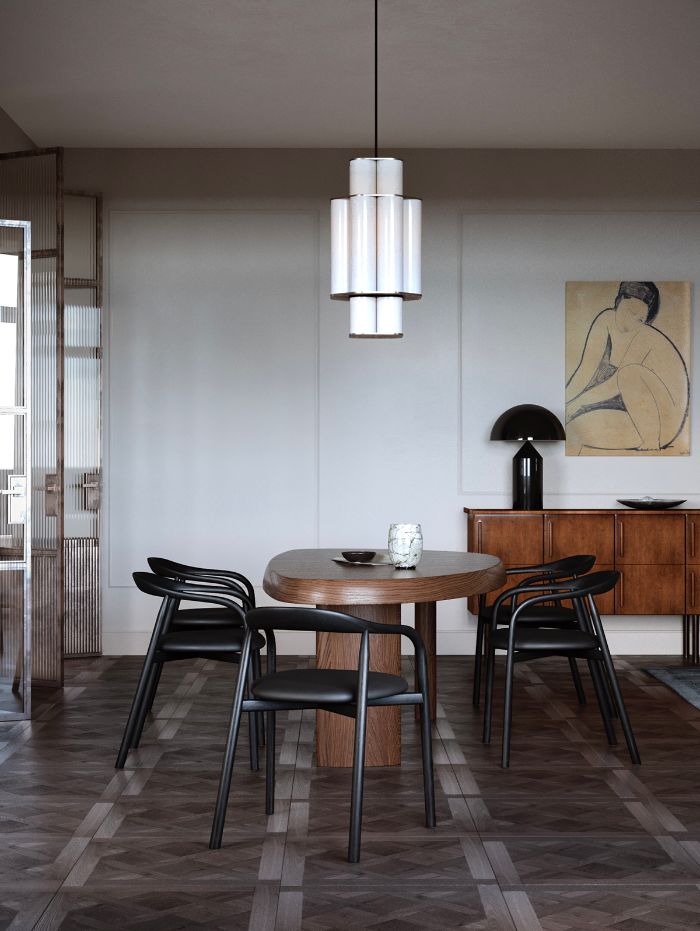 餐桌分隔了客厅与厨房,木质的椭圆餐桌搭配磨砂黑靠背椅,沉稳而古朴, 现代艺术感十足 。