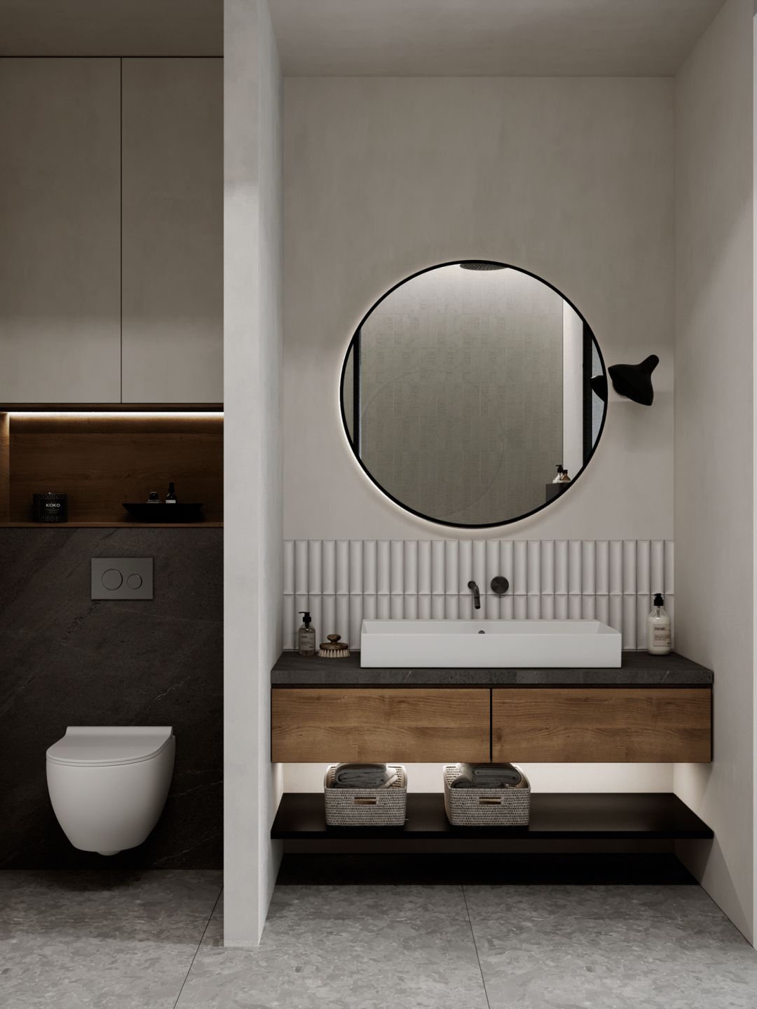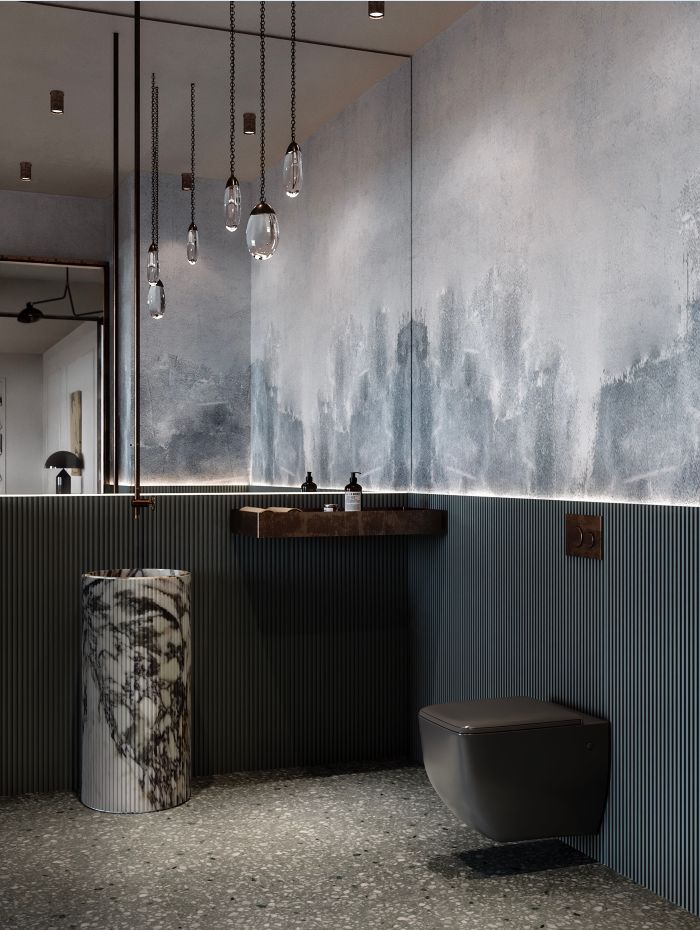 进屋玄关的右手边是公卫 ,灯带将水墨质感的墙纸与墨蓝色竖纹半墙分隔开来, 现代设计与东方美感相得益彰 。