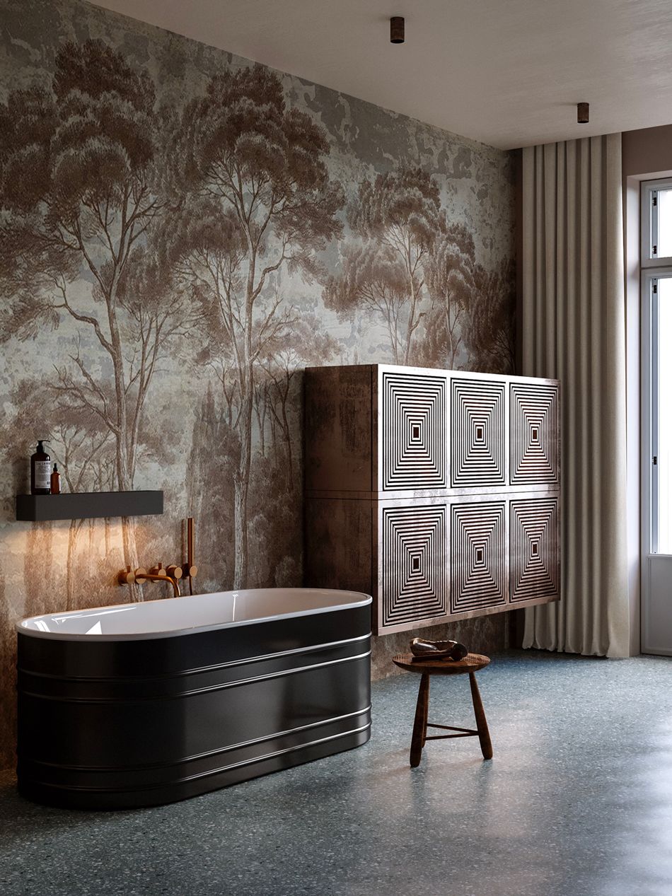 卫生间的设计非常现代化, 黄铜、藤编等复古元素作为点睛之笔, 美观脱俗。