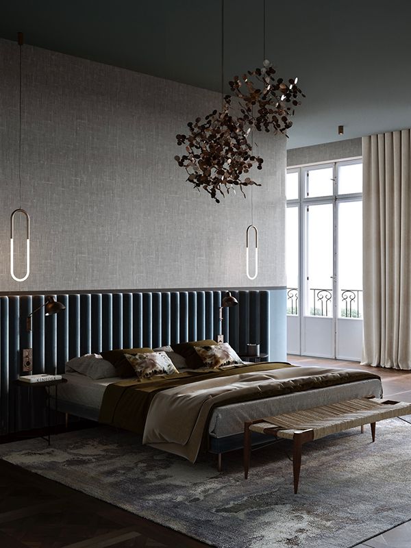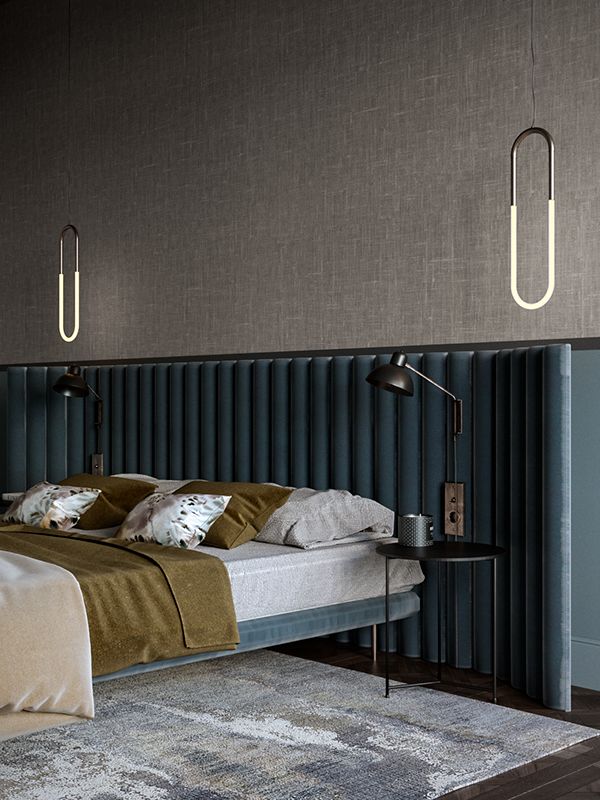 卧室整体大气又时髦,布艺墙面、蓝色天鹅绒隔断,橄榄色床品、哑光的金属壁灯,无一不昭示经典的复古格调 。