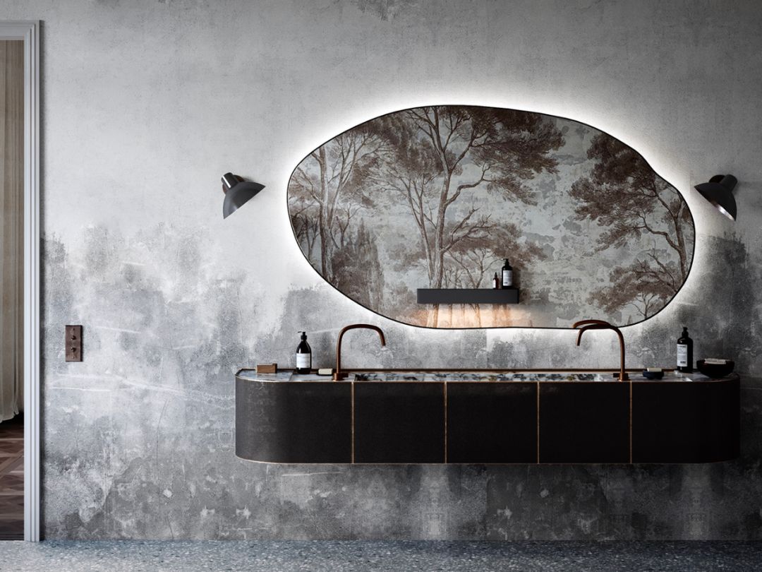 另一间主卧卫生间,更是中式韵味十足。不规则的椭圆镜面、曲面洗手台在水墨背景下,更显设计感 。