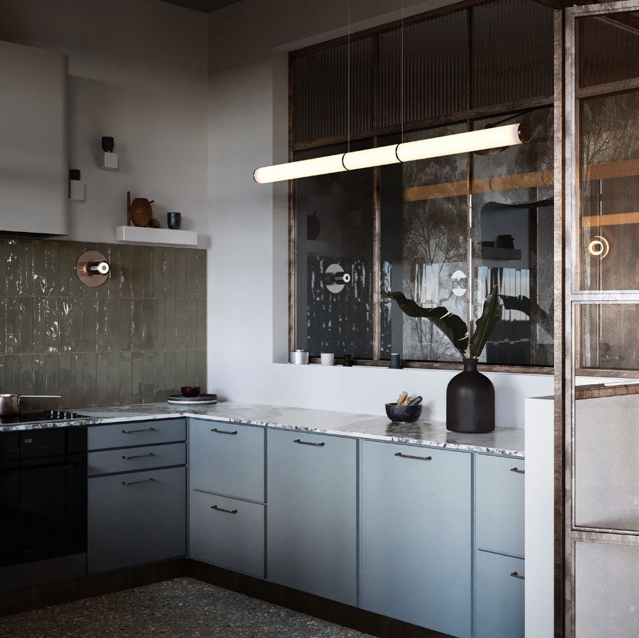 大理石台面搭配灰蓝色橱柜, 精致清新 。