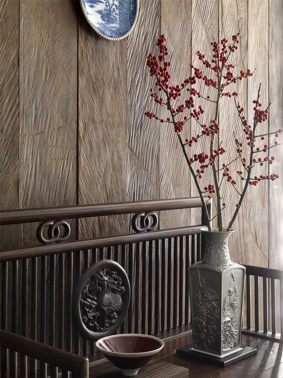 中式装修中,色调以红色、黑色为主,整体呈现出古朴典雅的感觉,因此我们在挑选时要选择木质、陶瓷、石头等材质的、体现中国文化的 装饰物,如字画、仿古瓷器、玉雕、香炉等。