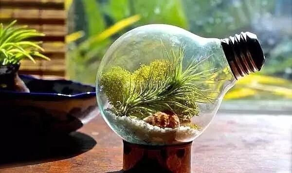 将灯头的黑色部分用钳子去掉,再用十字改锥将里面的灯芯敲碎后小心取出,把泥土倒进灯泡,小心放入准备好的小植物。用胶水把灯泡固定在圆形底座上,漂亮的小盆景就完成了~