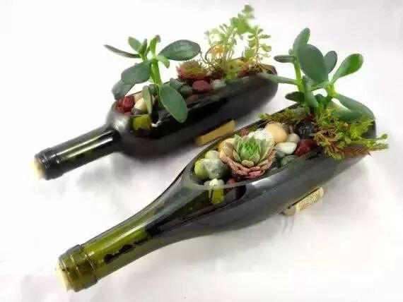 对于爱喝酒的人来说,家里酒瓶肯定不少。将空酒瓶横切出一个口子,撒上泥土和石子,种上一些多肉,做好的酒瓶盆栽别具一格。