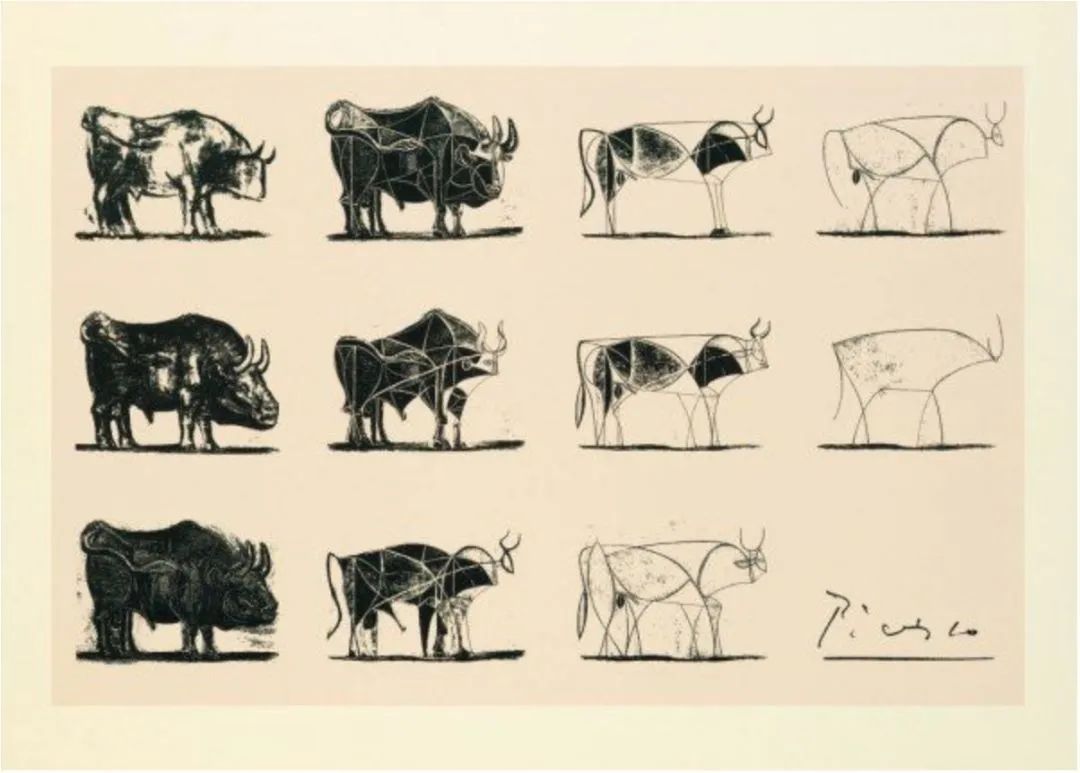 毕加索确实是画了一个完整的牛,然后通过自己的意识去删减,最后留下了几笔线条。中间的一切过程都是思考的过程。把一个写实的具象化图像,通过提取其中的有效信息,逐渐简化,最终获得一个最简练的抽象化图形。
