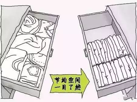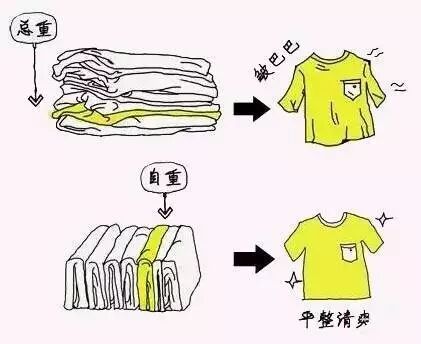 原来,传统的叠放衣物会受到层层的重压,产生折痕。而竖放衣物,衣物只承受自身的重量,纤维放松就自然平整清爽。