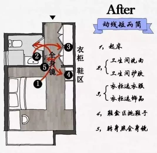 护肤品从梳妆台转移到了卫生间。全身镜从墙角调整到衣柜对面。鞋子从放玄关改为放在主卧。改造后,只需要5大步骤,总共4米的距离。