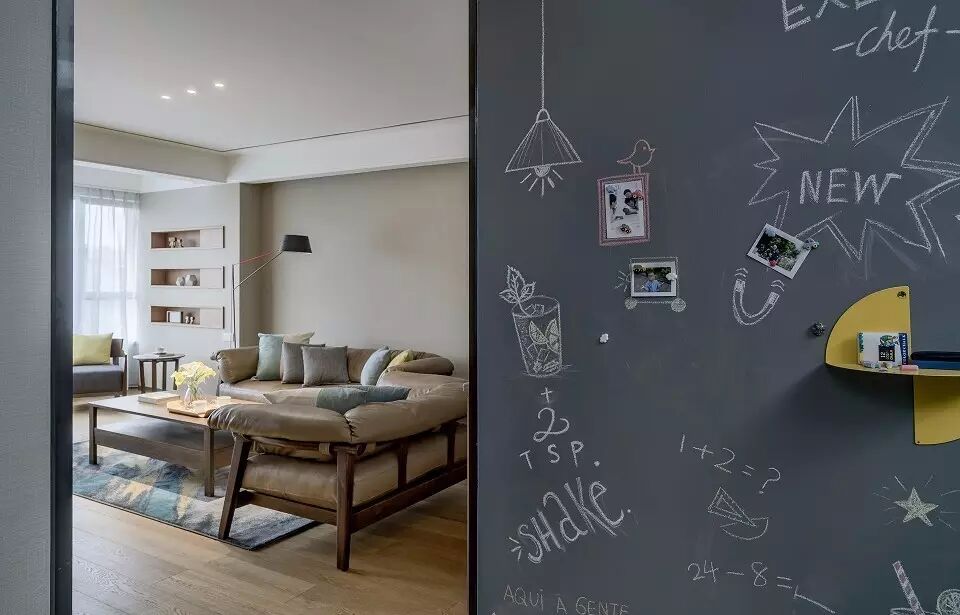 餐桌边的那面墙,应该刷成黑板墙。孩子吃饭,靠边的那面墙,已经开始变花。刷成黑板墙,耐脏,可涂鸦。 当然,餐厅采光要足够好才行。