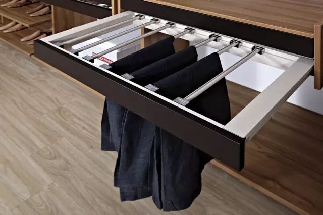 裤架:高800—1000mm。裤架专门用于悬挂裤子,不易起褶皱。挂杆到底板的距离不能少于600mm,否则裤子会拖到底板上。建议选购成品金属裤架,可以悬挂12条裤子;而一般工厂制作的裤架只能悬挂8—10条裤子。还可以安装一个挂衣杆,用衣架悬挂裤子,比较节省空间。