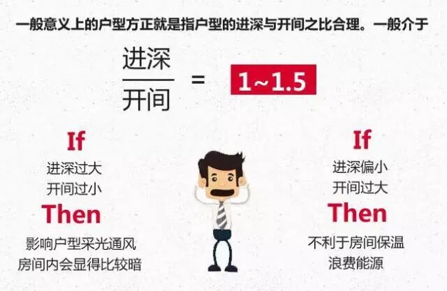户型想方正,进深和开间之比最好是介于1到1.5之间。进深太大了,不利于通风和采光,进深太小了,影响保温。