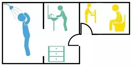 三式分离是最适合中国家庭的分离布局。三式分离的卫生间占地面积大约为 4.5㎡~8㎡,除了能满足干湿分离要求,还能达到比较高的使用效率,适合两房一厅、三房一厅等容纳人数较多的户型。