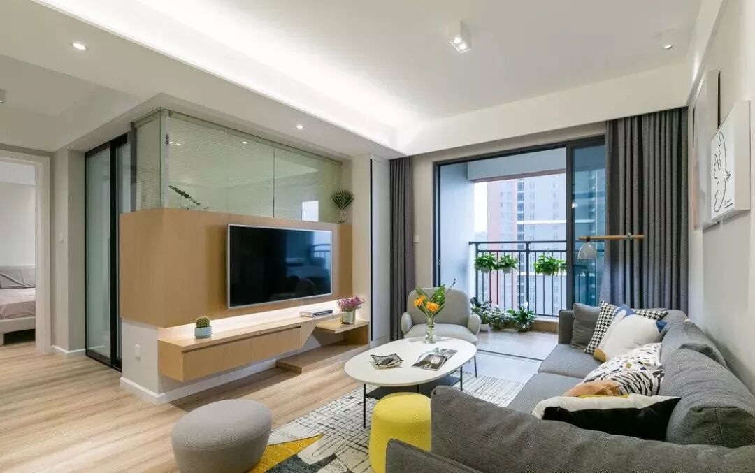 客厅采用二段式设计电视墙,利用L型转角清玻与玻璃推拉门,视觉开阔明亮。