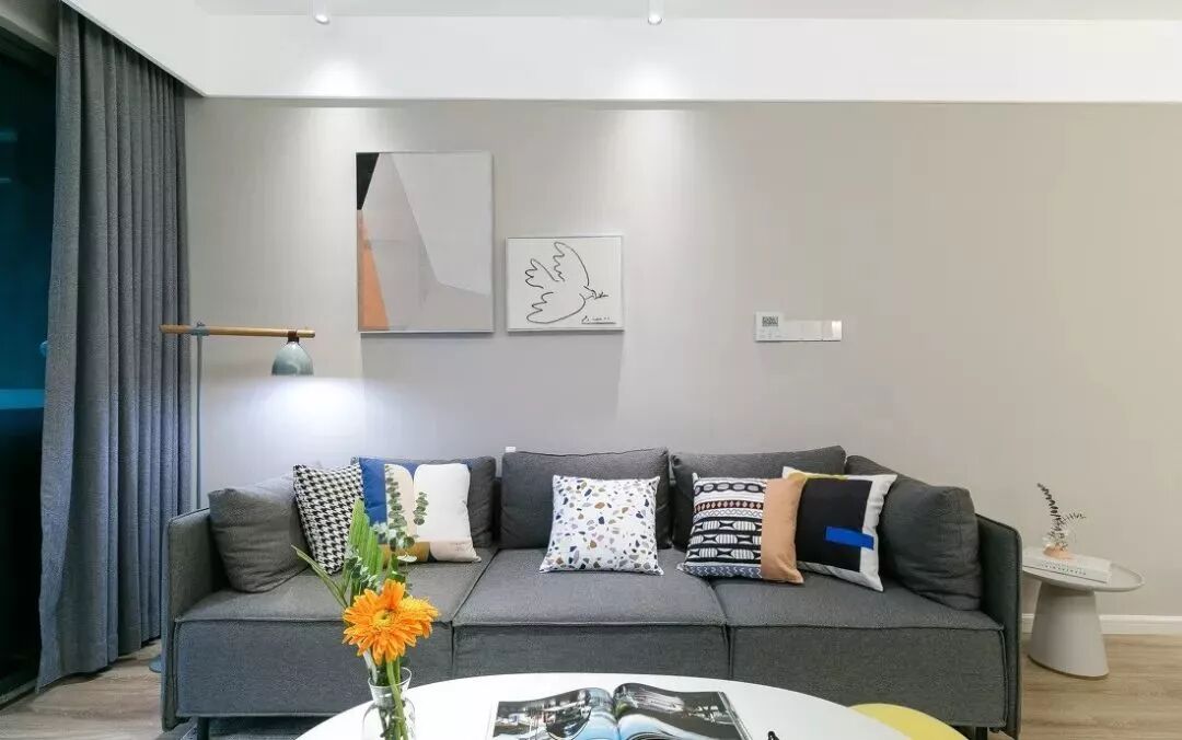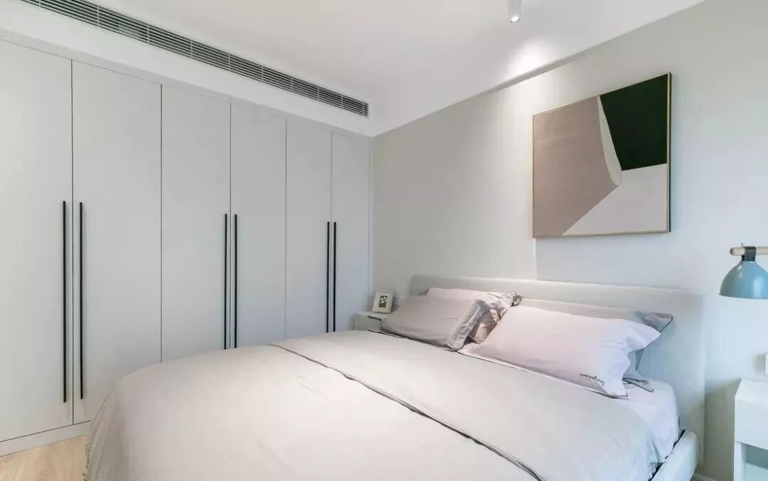 主卧以低饱和度的中性灰搭配裸粉色,蓝色台灯点缀空间,营造出柔和漂亮的安静氛围。