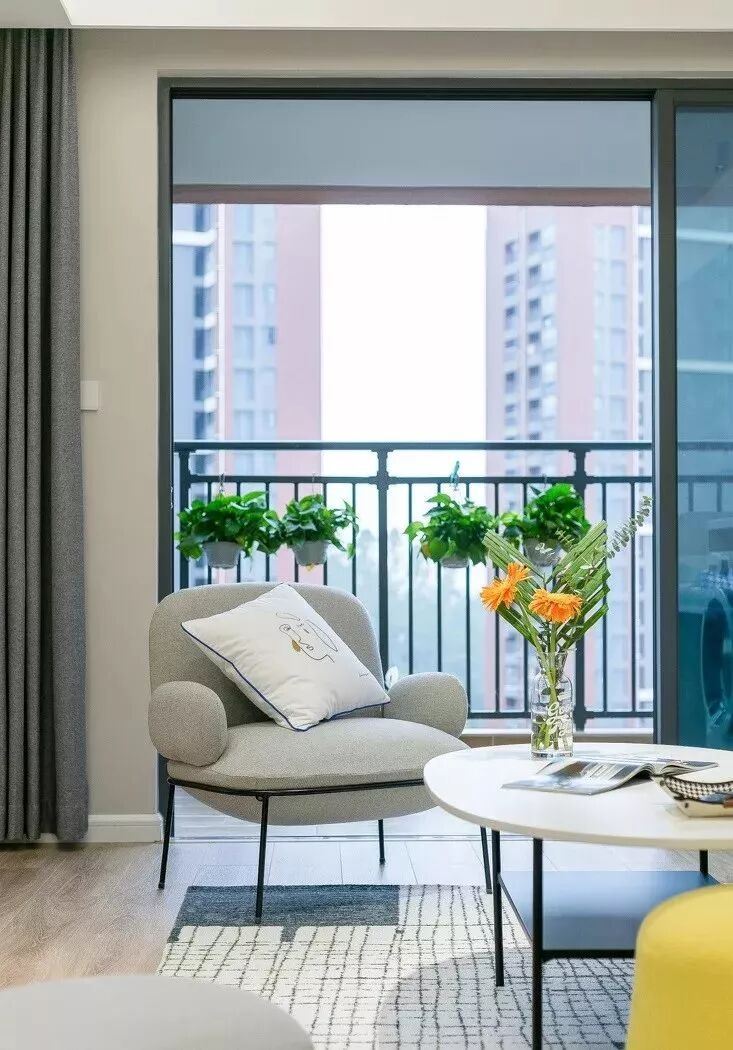 阳台安装了玻璃门隔断,一侧装洗衣机柜,一侧打造绿植后花园。全屋采用线条不复杂的北欧风萌系家具,细腿造型让空间活泼通透。