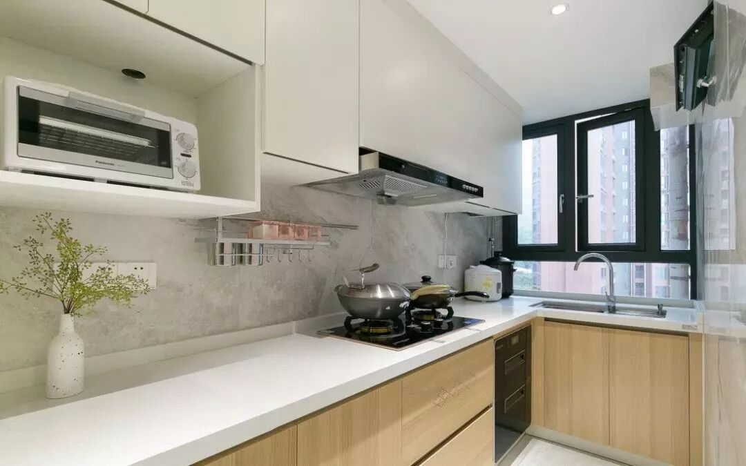 厨房合并小阳台后,采光好了不少,上白色下木色橱柜设计,通过白色大理石台面过渡,简洁大方。