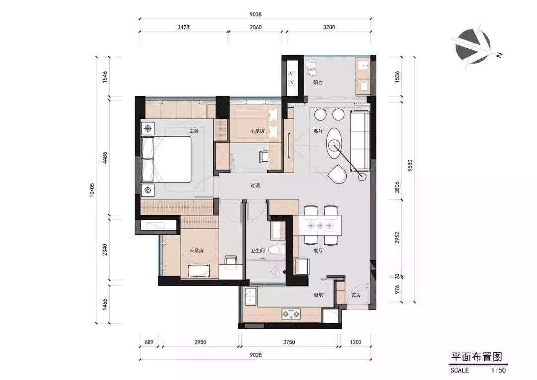 1、过道向小孩房方向平移,争取出超给力的餐边柜,小孩房用玻璃移门,解决了采光问题;