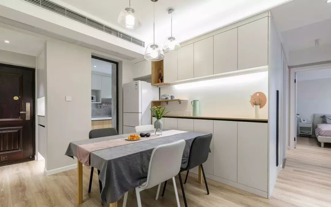 餐边柜一直做到了转角过道,延伸了餐厅空间,白色柜体点缀温润木色,桌面铺上桌布更有柔和温馨的情调。