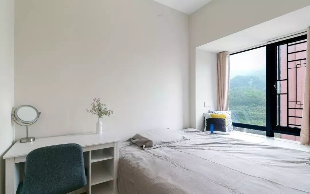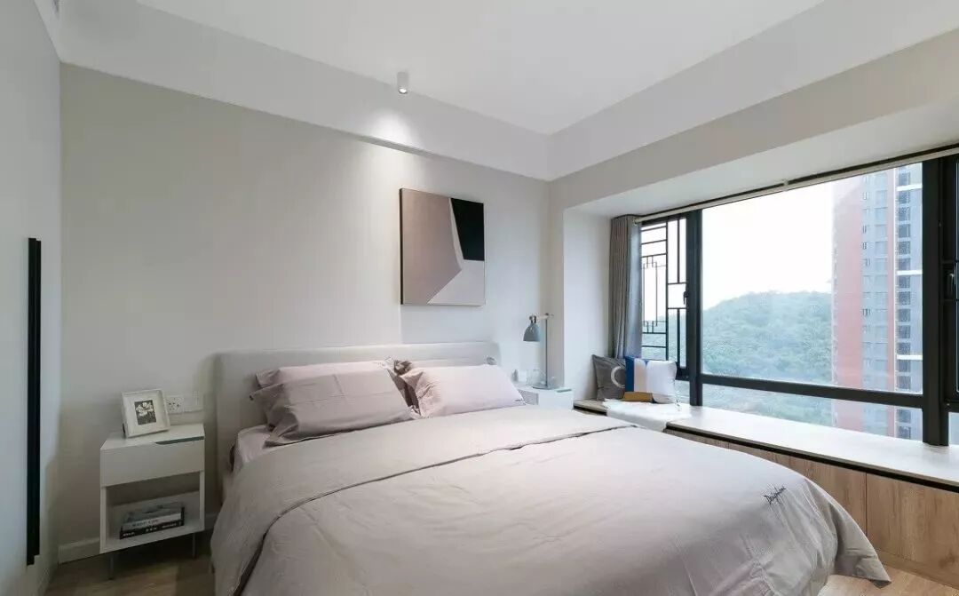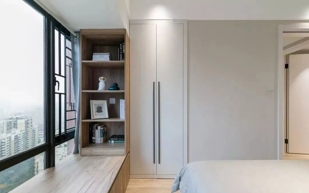 飘窗一侧打了收纳柜,旁边墙面还做了嵌入式柜,主卧的储物空间很充足。