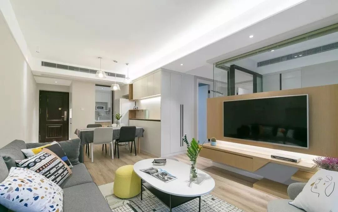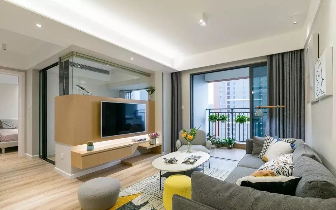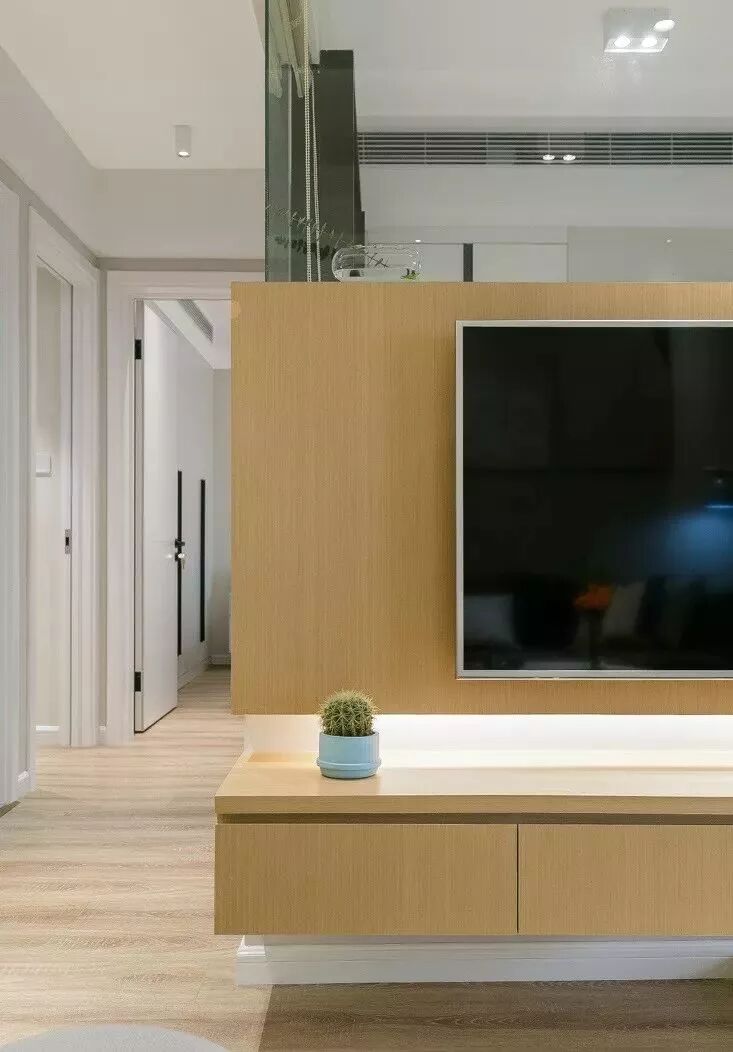 原木色的电视墙面里内藏灯条,光影设计增加了家里的温馨感。