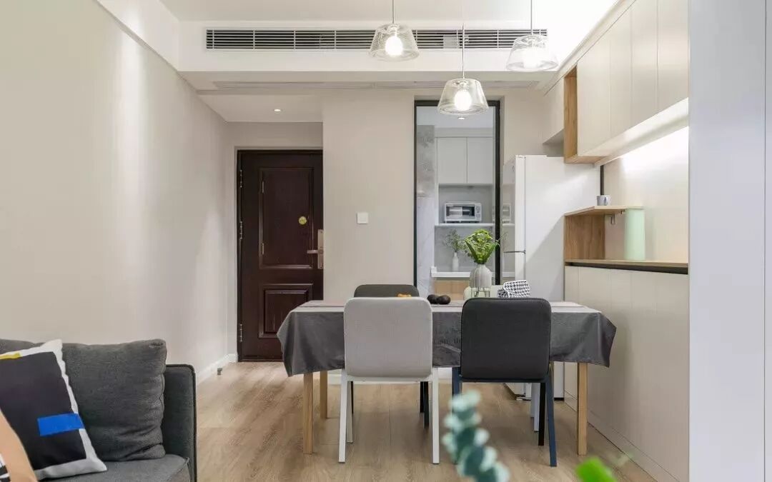 进门后先是餐厅,旁边的厨房门挺小的,采用全玻璃弱化了存在感。