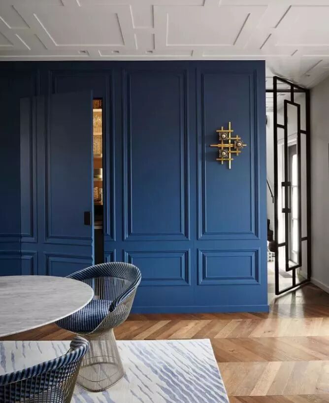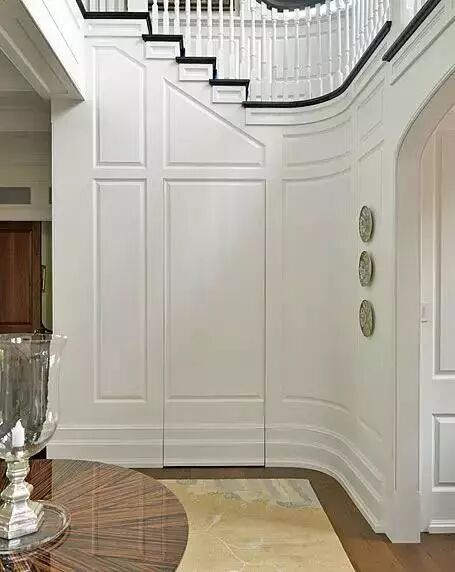 用来护墙的饰面板,同样可以巧妙地安装在门上。你可以在装护墙板时,顺便做一个隐形门,但不建议为了隐形门而装上一整面墙的护墙板,费用真的承担不起呀。