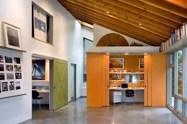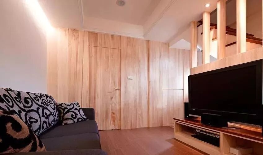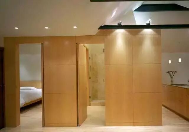 可以在家里通顶的大柜子中,做一扇门隐藏其中。比如下面客厅一整面的通顶大柜子中,藏着一扇通往卧室或者卫生间的门。