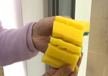 先把海绵刷放在凹槽上比量一下,用笔标记出凹槽的凸起的位置。画出虚线后,延着虚线把海绵刷剪开,这样海绵就能与纱窗的凹槽吻合啦!
