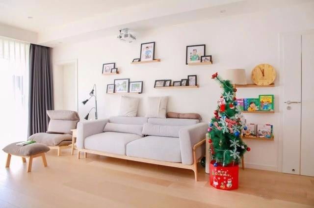 沙发背景墙也是如此,我们不用把照片给钉在墙上,直接放在隔板上就好,每块隔板确定好大小和位置,加上合适的装饰画、照片,让人感觉非常温馨呢~