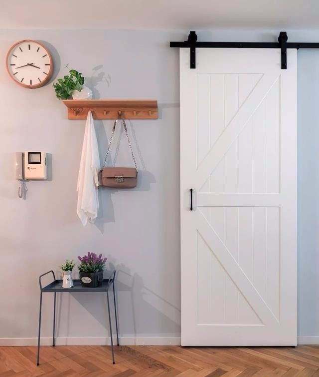 在入户玄关的地方,一个隔板架搭配一些挂钩,我们一进门,就可以把外衣和包包卸下,上方还可以摆放绿植来清新空气和增添自然的气息。