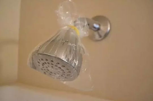 往袋子里灌入白醋,套在淋浴头上,用橡皮筋固定住,一小时后取下塑料袋即清理了淋浴头,还能杀毒消菌。