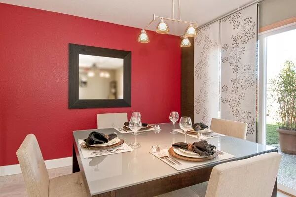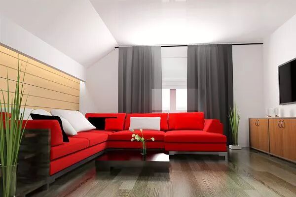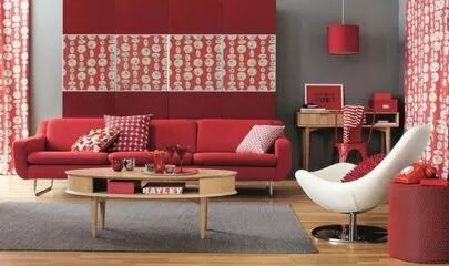 红色是最抢眼的颜色,对视觉起着强烈的冲击作用。所以,当红色被使用在家具和窗帘等大物品时,一定要注意缓和压迫感,尽量不用鲜亮的红色,而改用灰色调或暗色调的红色。