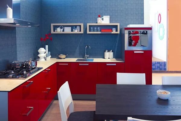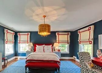 深蓝色与红色相间搭配也是很出色的。红色与深蓝色搭配,在鲜亮的色调中加入素雅的深蓝色,会使得整个房间格调高雅、且具有现代感,犹如“在安宁中透露华丽”。