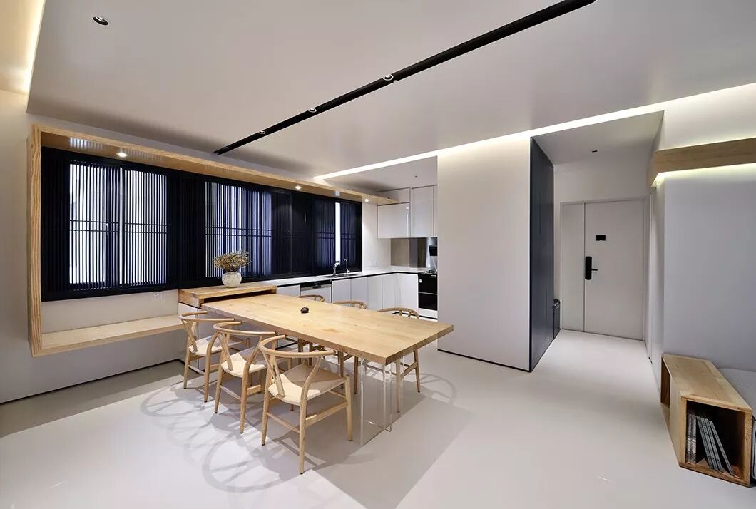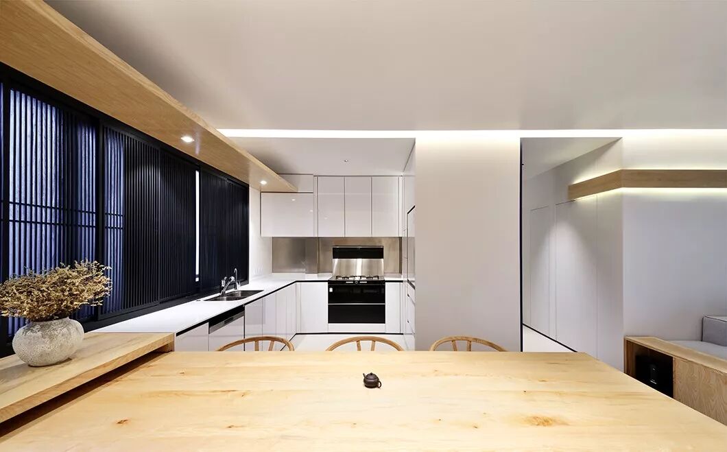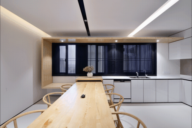 一条木板条不疾不徐地从天花一路延伸到墙身,转折至窗台下。如此一来,既可当作休闲卡座,又恰如其分地和厨房水吧、餐台连为一体。