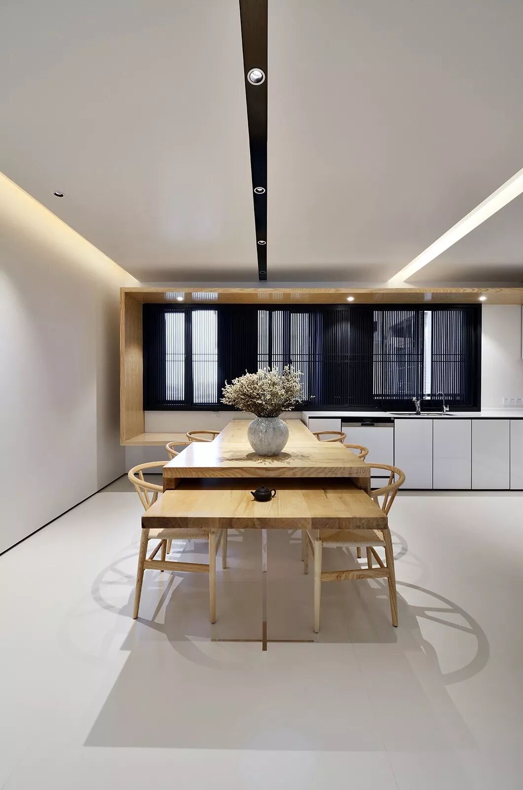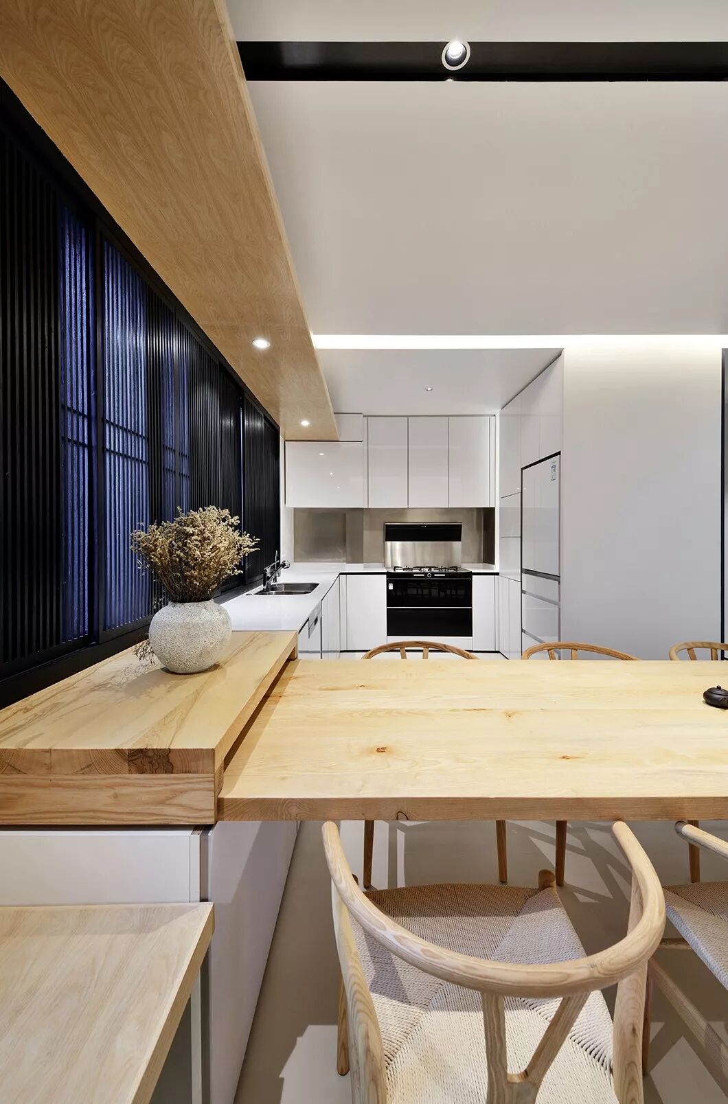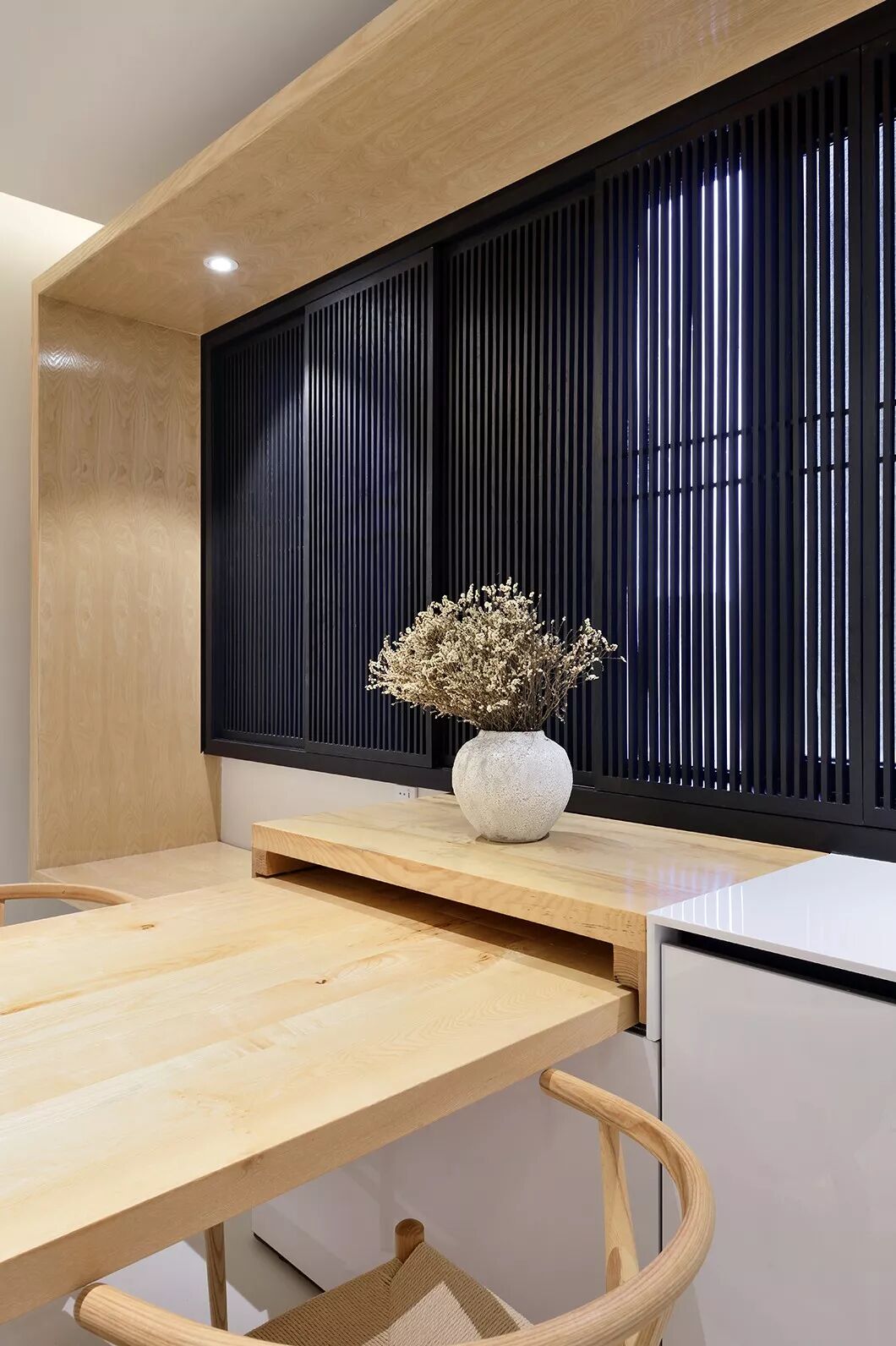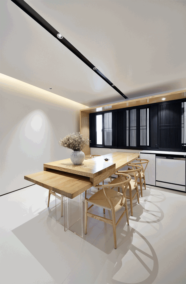 餐桌的尽头,是一扇黑色竖条屏风的窗。看似屏风,却也是窗帘。日升日落,云卷云舒,八个方形木条框格栅可根据不同时间的光线移动开合,透过细细的格栅,光线在室内投下斑驳光影,带来绵绵暖意。