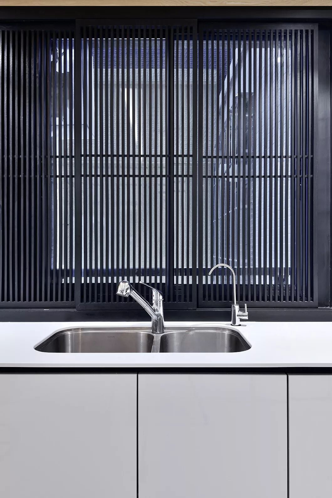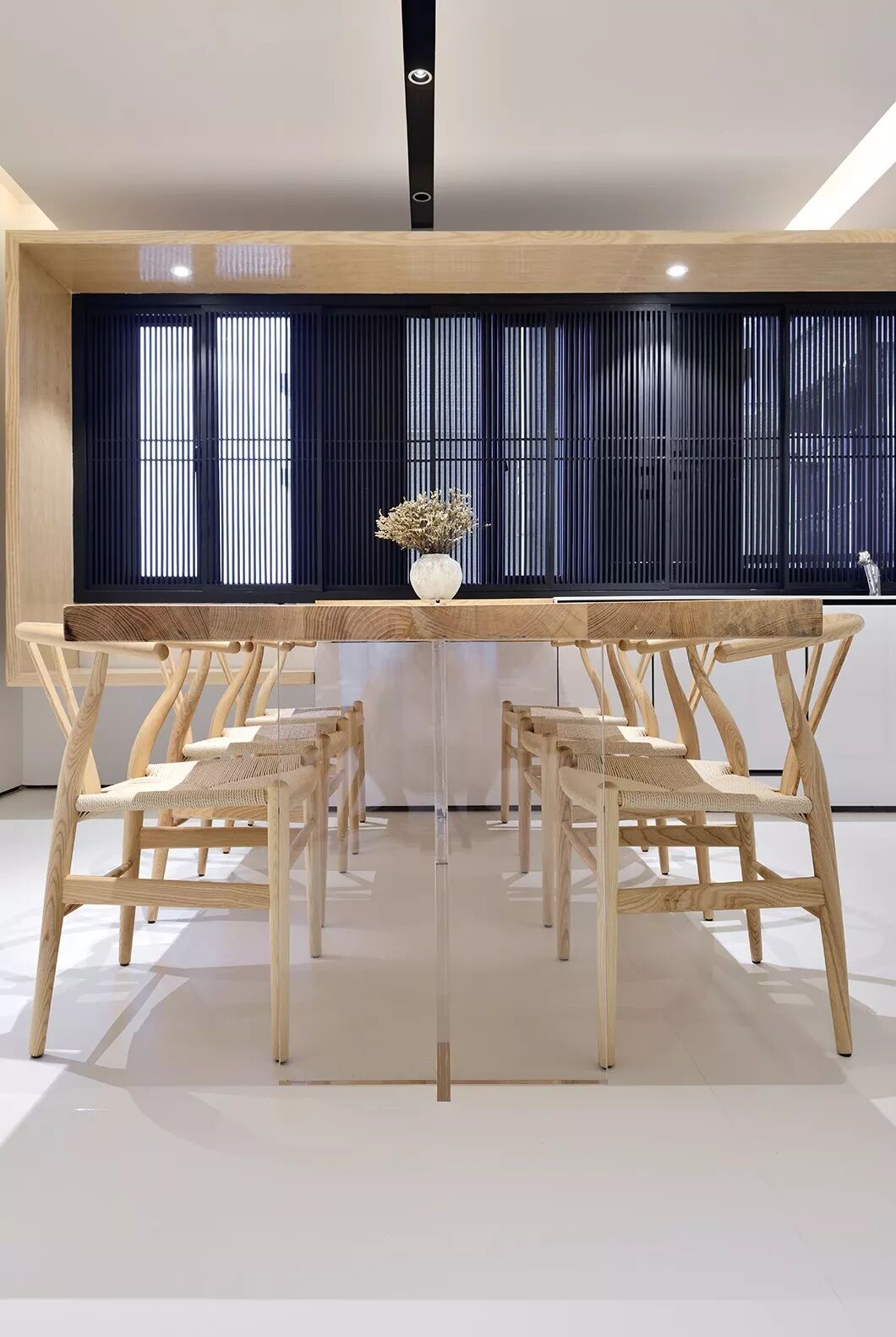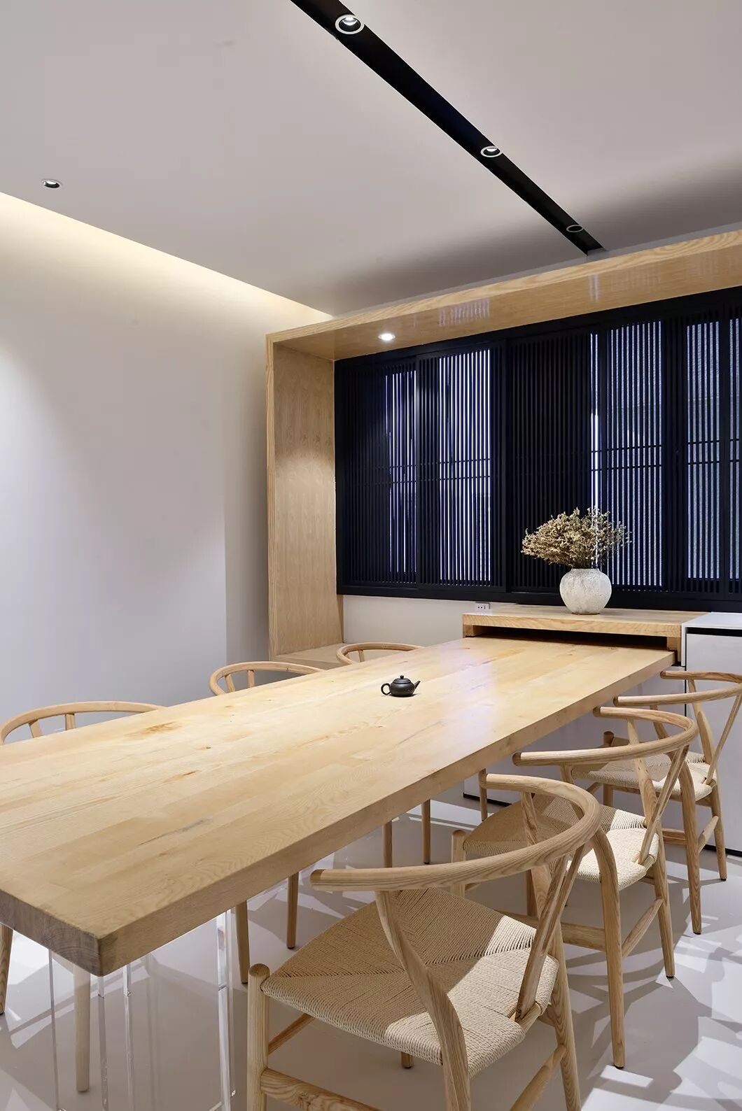 餐桌的尽头,是一扇黑色竖条屏风的窗。看似屏风,却也是窗帘。日升日落,云卷云舒,八个方形木条框格栅可根据不同时间的光线移动开合,透过细细的格栅,光线在室内投下斑驳光影,带来绵绵暖意。
