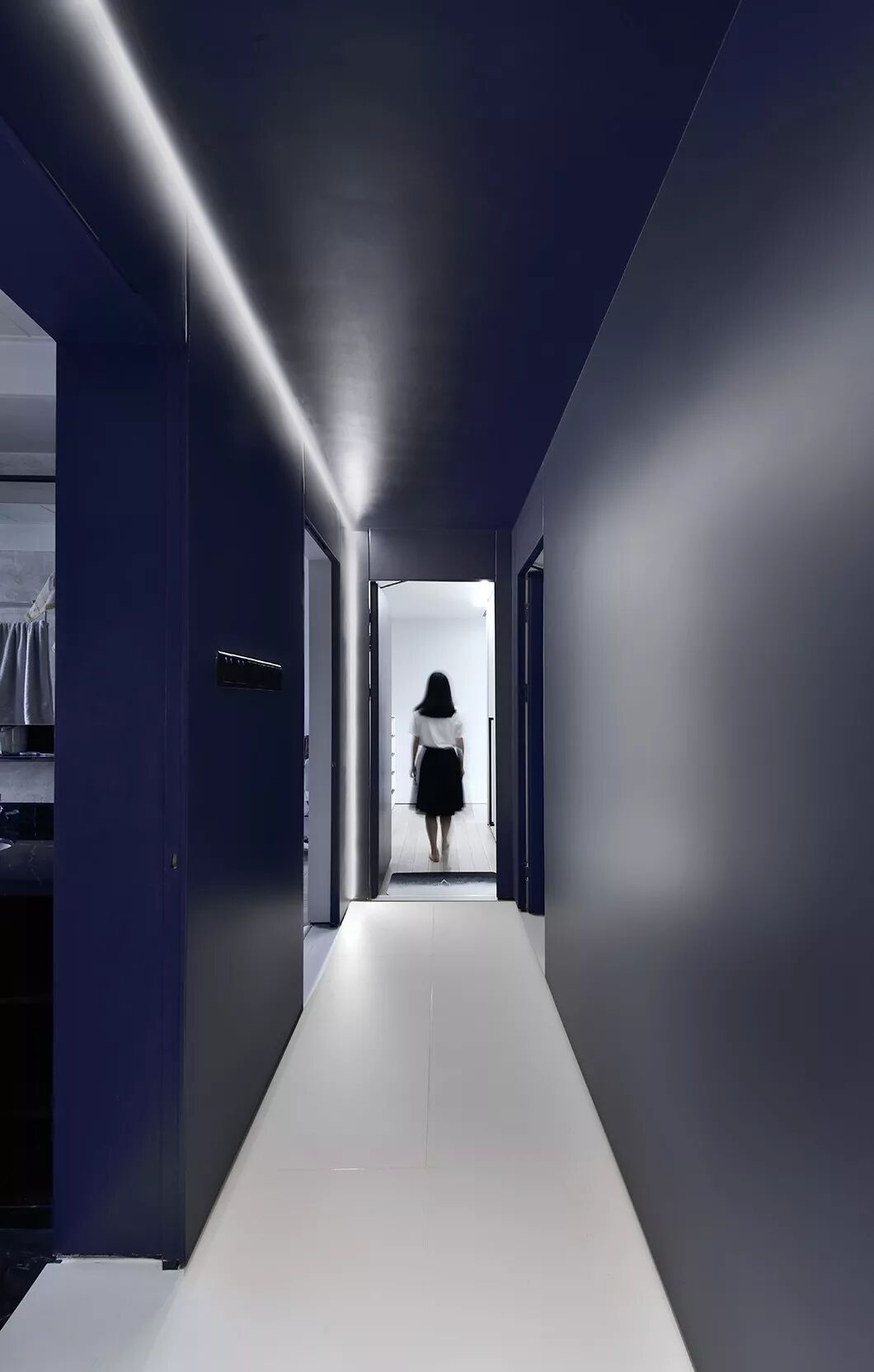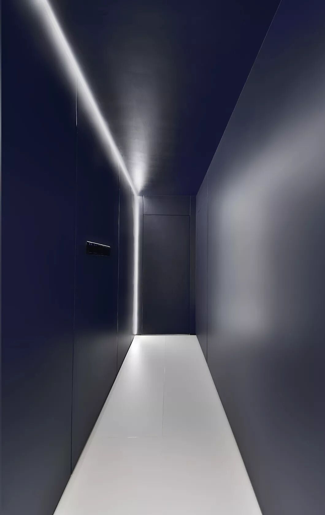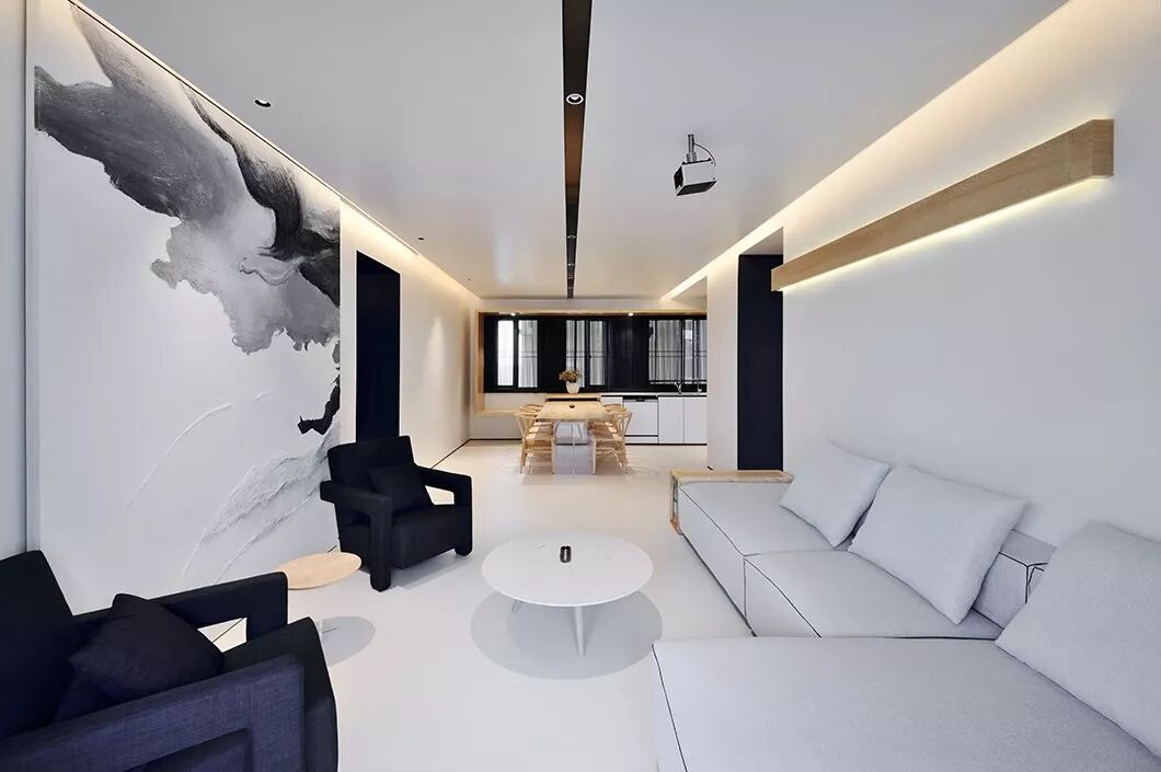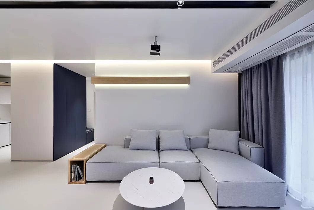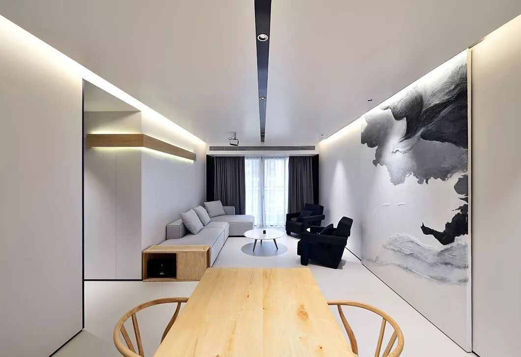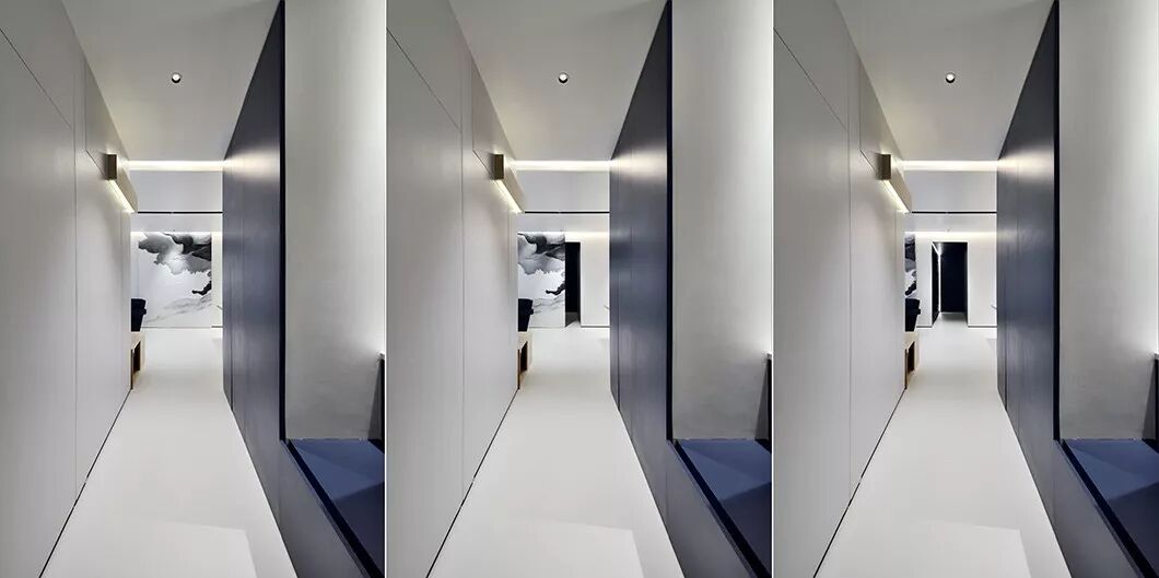 和常见的天花不同,这里没有中间照明,而是一道从墙角飞出的光带,从天花一角延伸至墙面。如此一来,所有房间,皆为暗门。