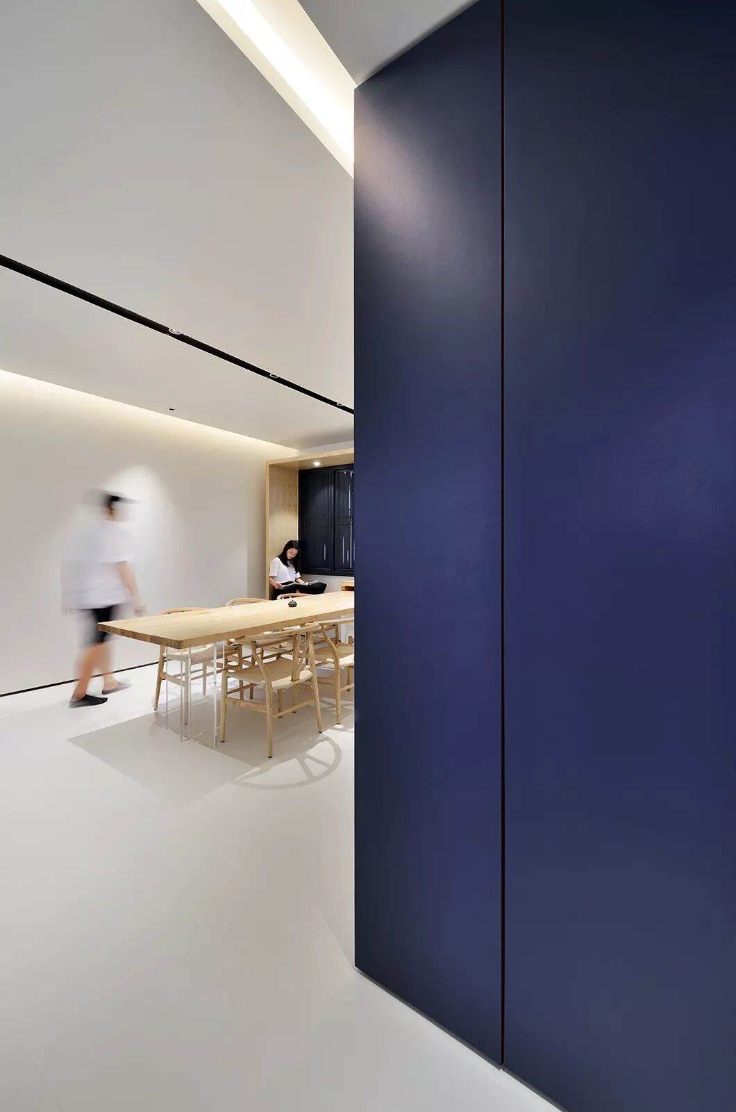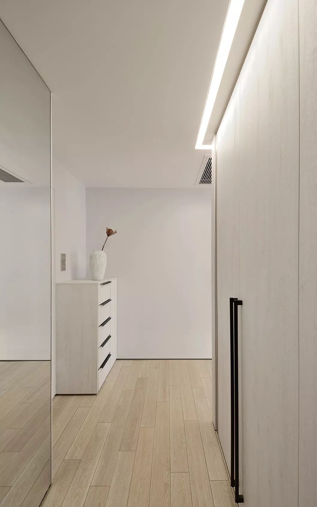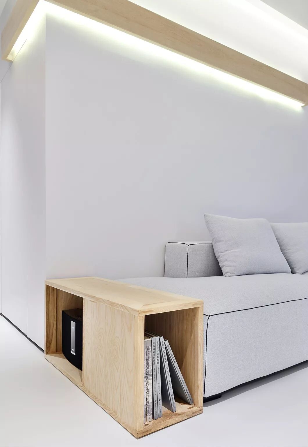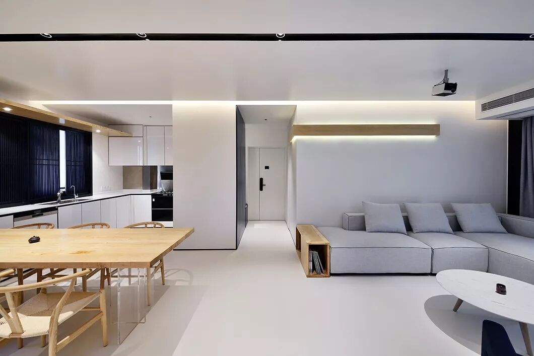 和常见的天花不同,这里没有中间照明,而是一道从墙角飞出的光带,从天花一角延伸至墙面。如此一来,所有房间,皆为暗门。