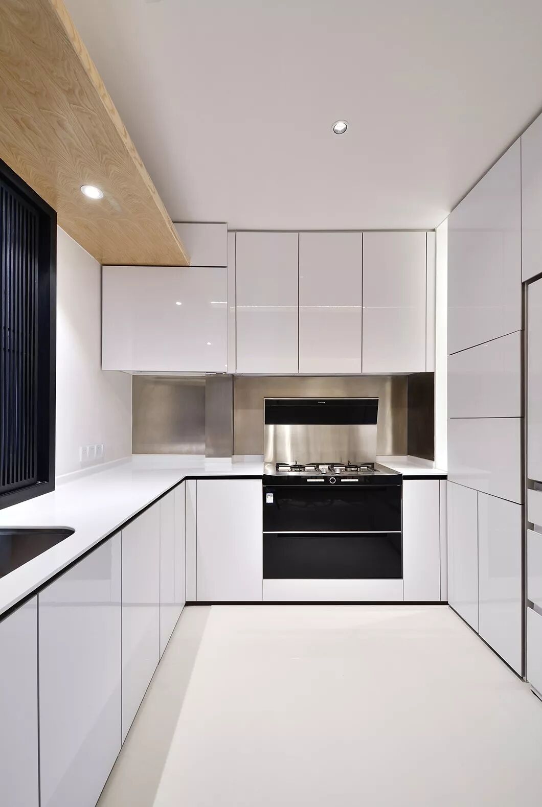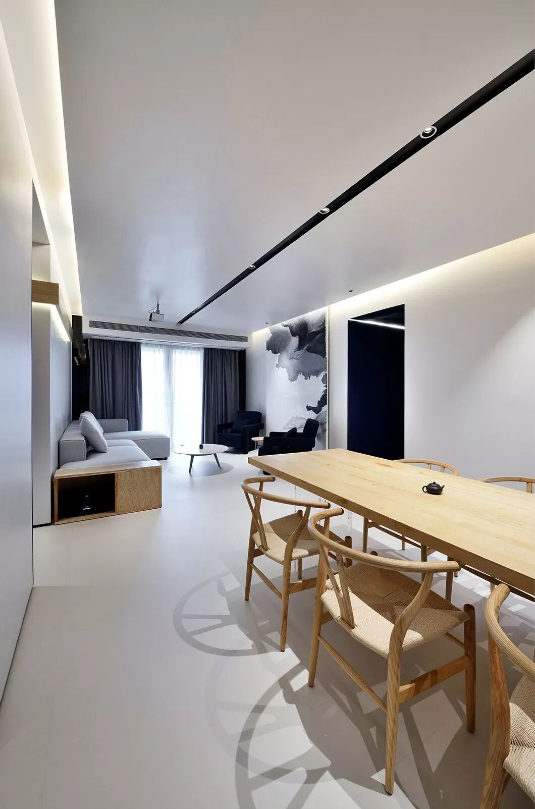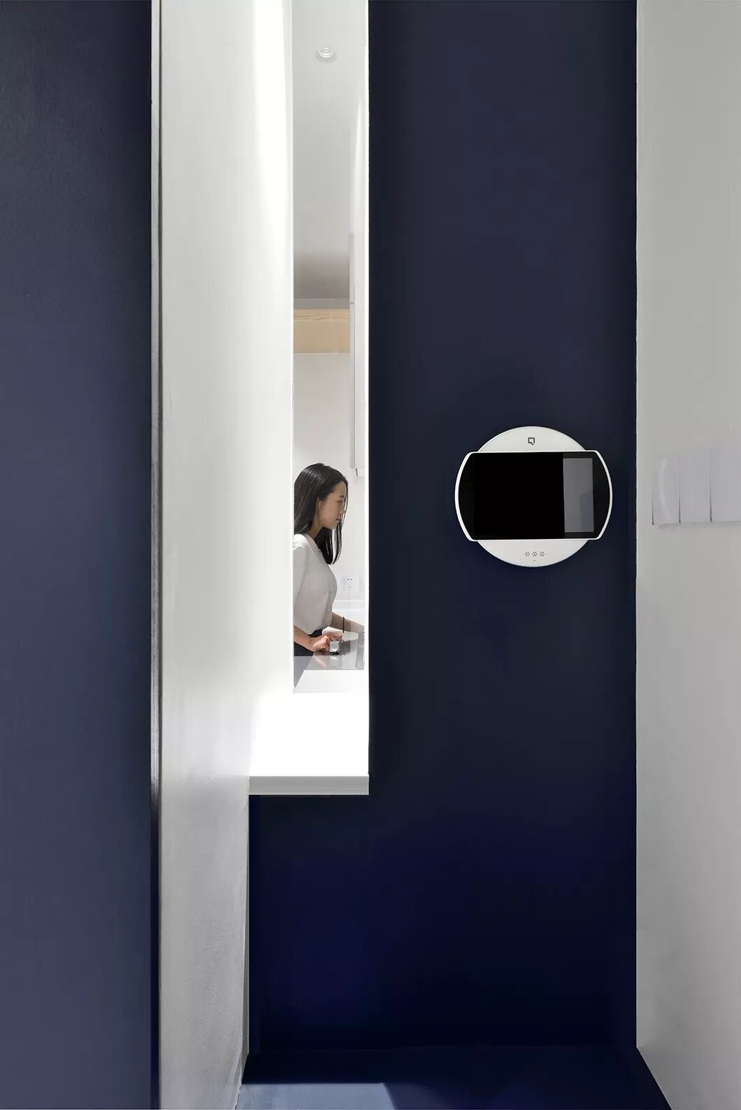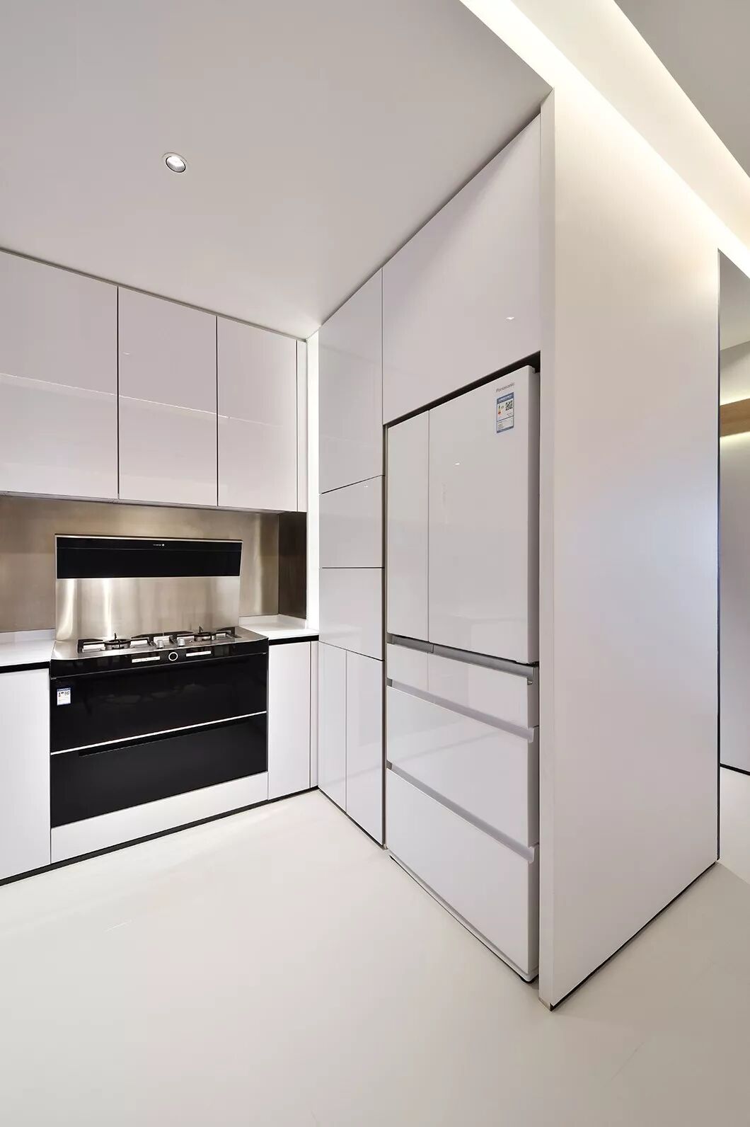 和常见的天花不同,这里没有中间照明,而是一道从墙角飞出的光带,从天花一角延伸至墙面。如此一来,所有房间,皆为暗门。