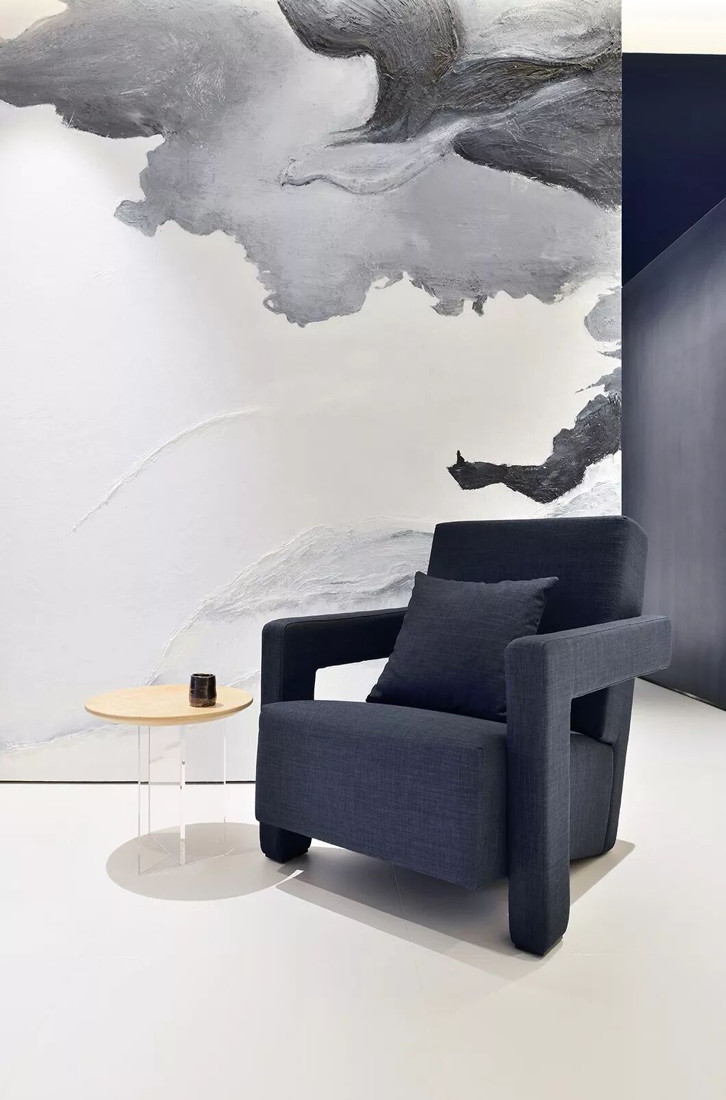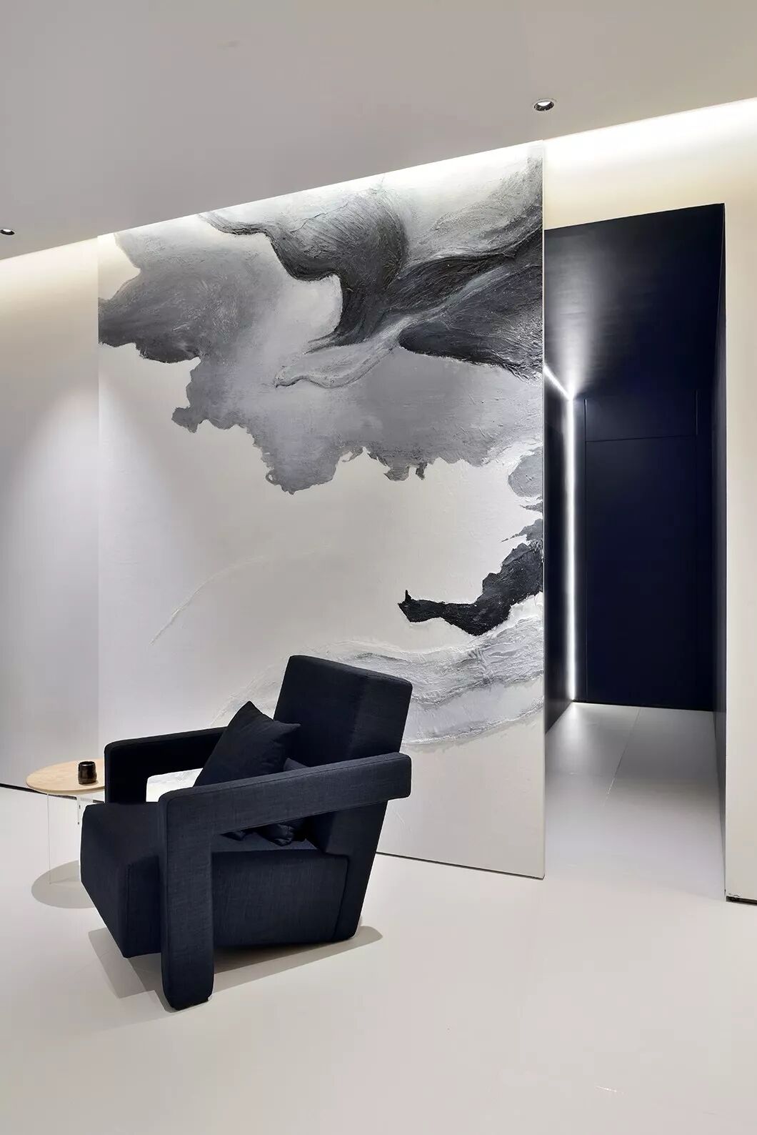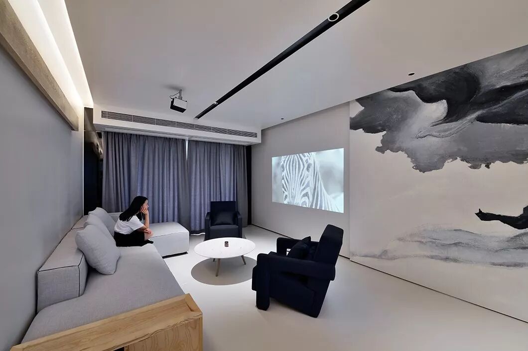 推门而入,便撞入了腾云驾雾的意境中。那是一幅2000*2700的巨大油画作品,可见主人开门见山海之胸怀。右手边伫立着蓝色墙体,细看还有一条缝隙,实为设计师的巧思