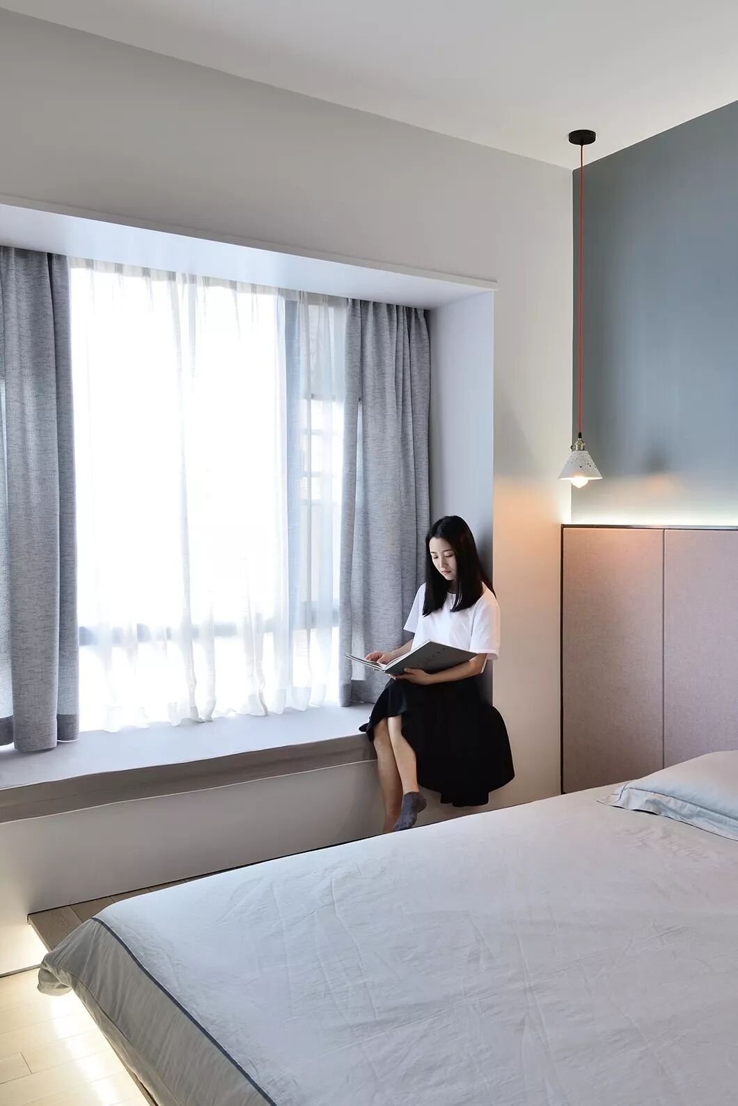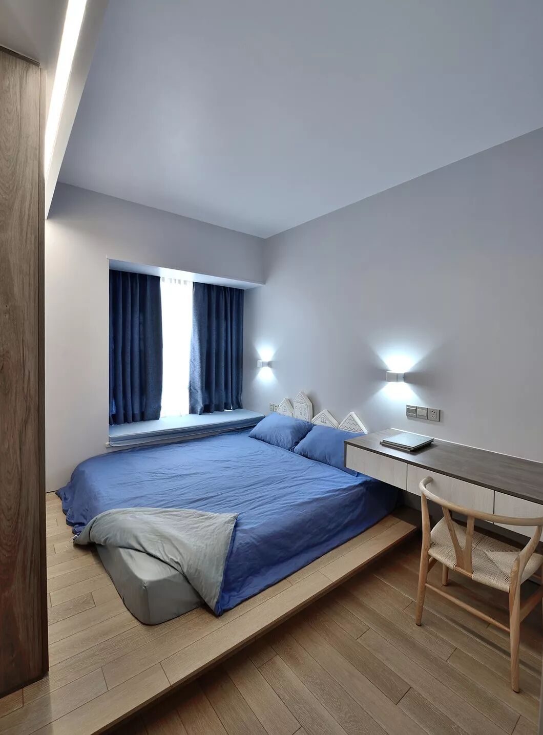 更深处的房间,也有蓝色的痕迹。舍去传统床架,换成榻榻米形式,除了澄净清明,这里什么都没有。当你步入其中,便被舒适绵长的睡眠拥抱,被静谧时光宠爱。
