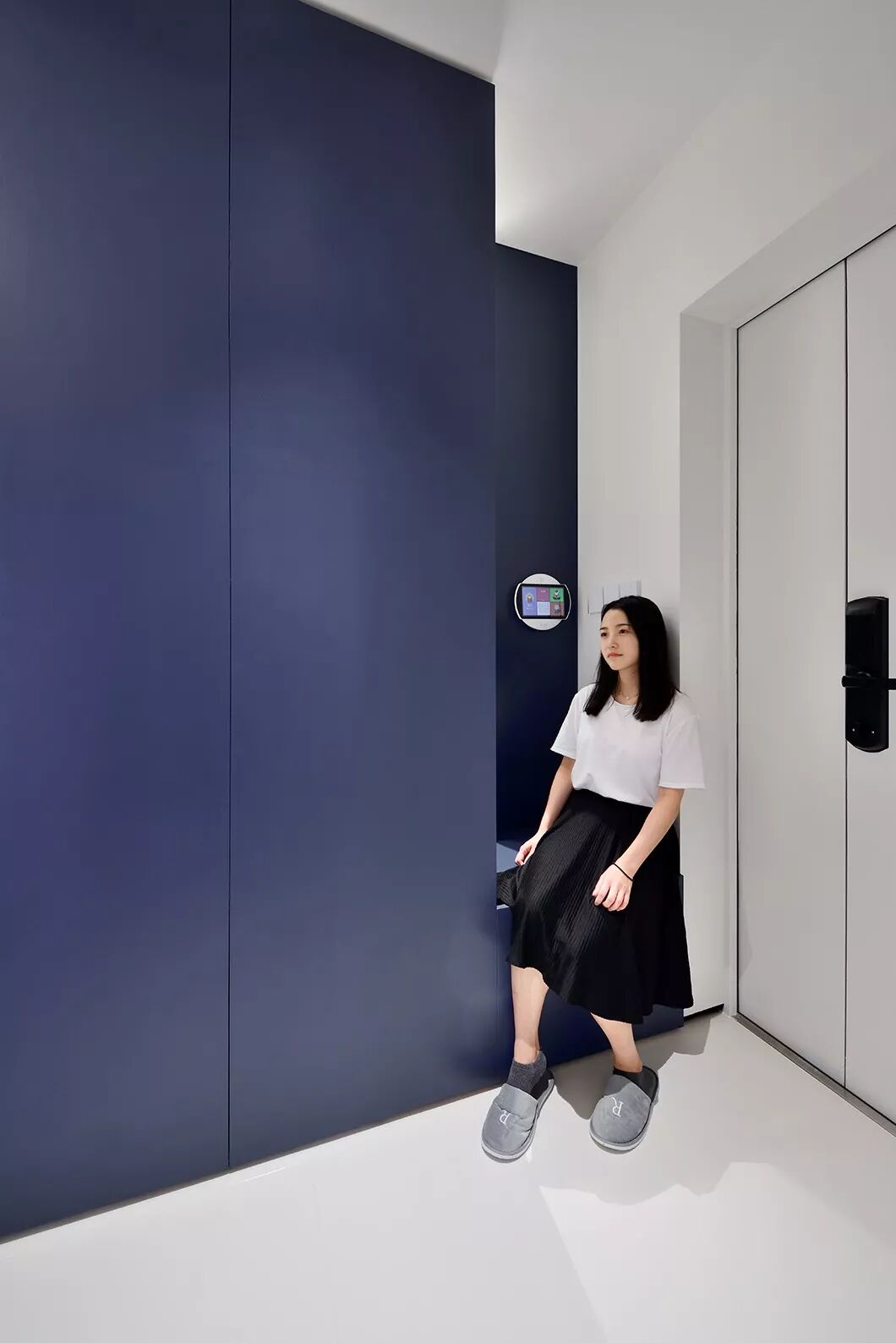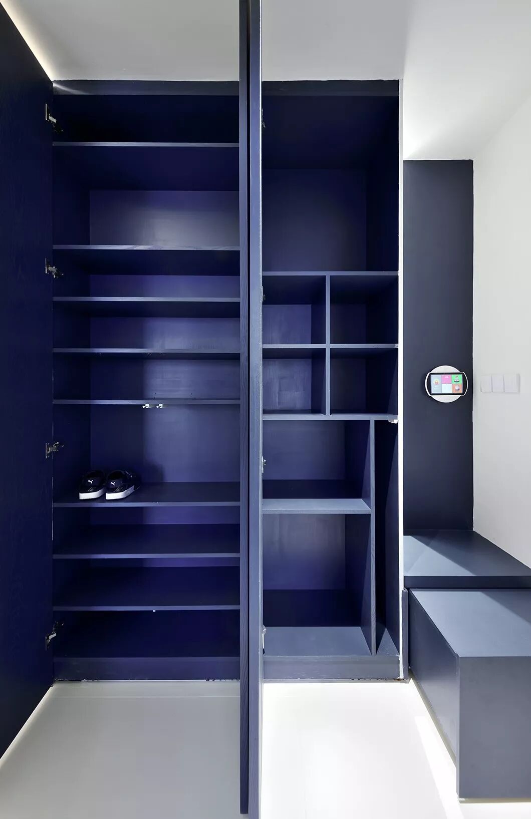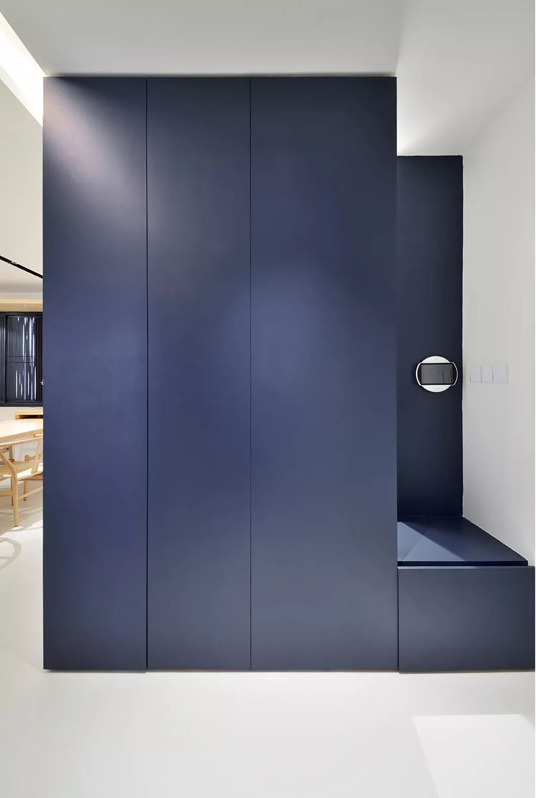 再凑近一瞧,蓝墙不尽然是蓝墙,还是暗藏式的鞋柜和储物柜。必要时,还可拉开边上的小卡座,方便换鞋。