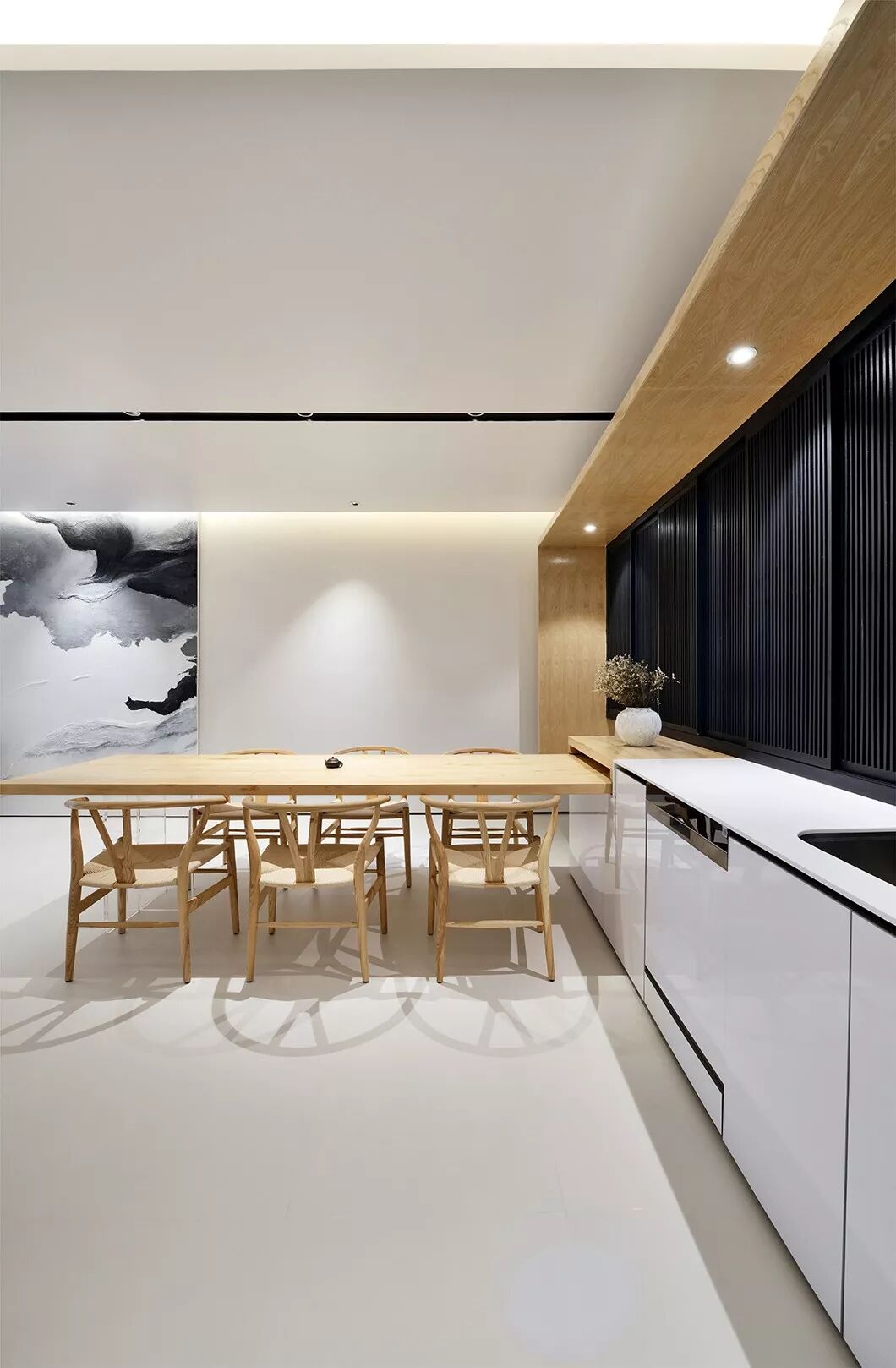 客厅的右面是餐厅,和开放厨房融为一体。目之所及,是分外清明、空旷舒适。