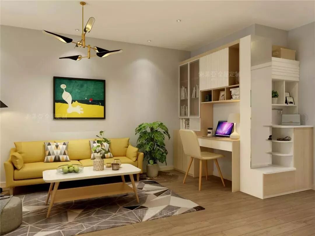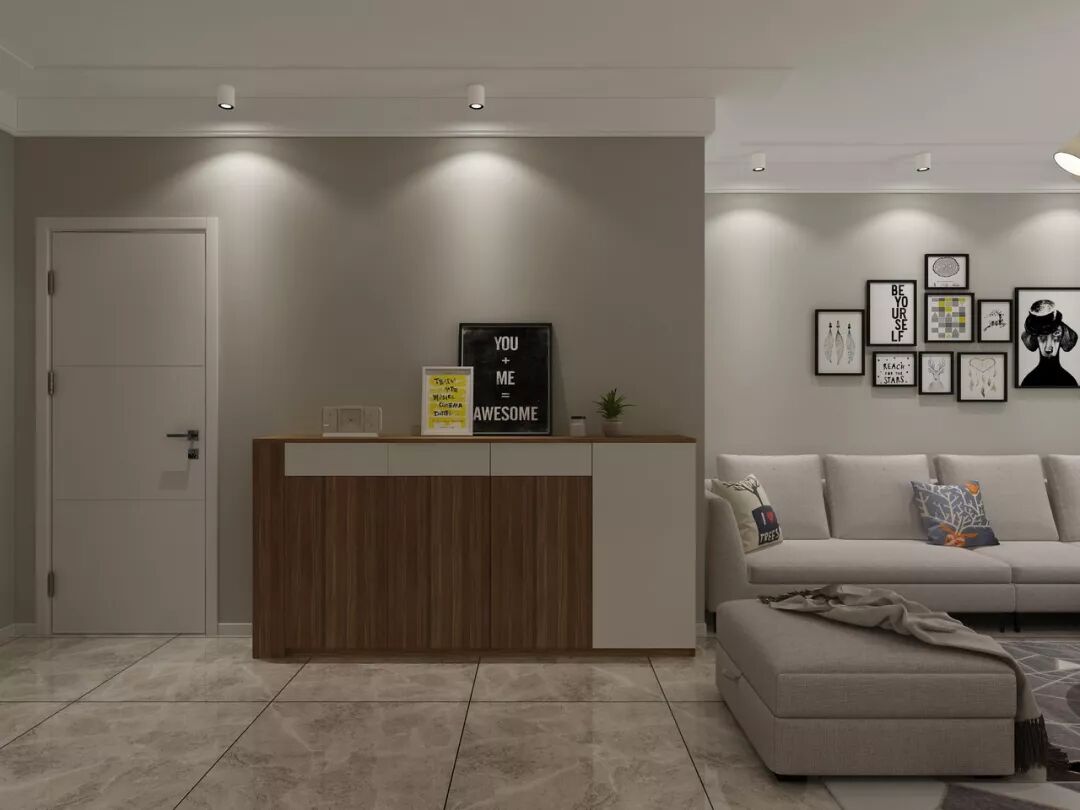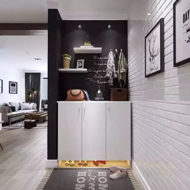 很多小户型是没有玄关的,开门直通客厅阳台的也不在少数(风水上这种格局并不好),这时可利用开门进来的1㎡设置一个玄关柜,用于收纳储物或做隔断墙使用。