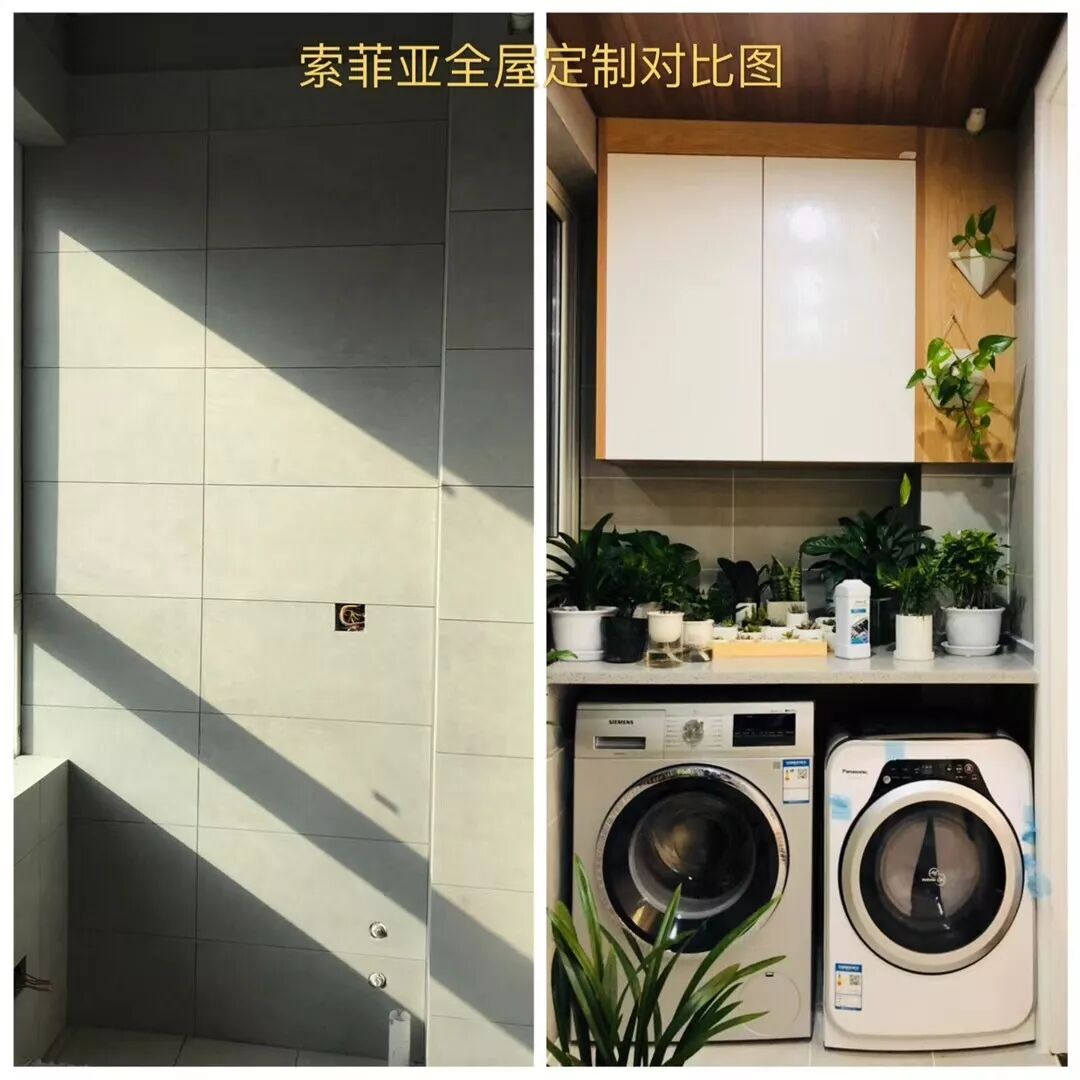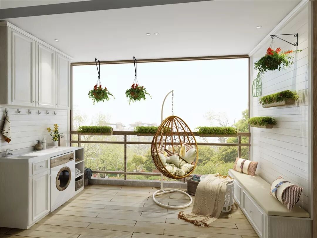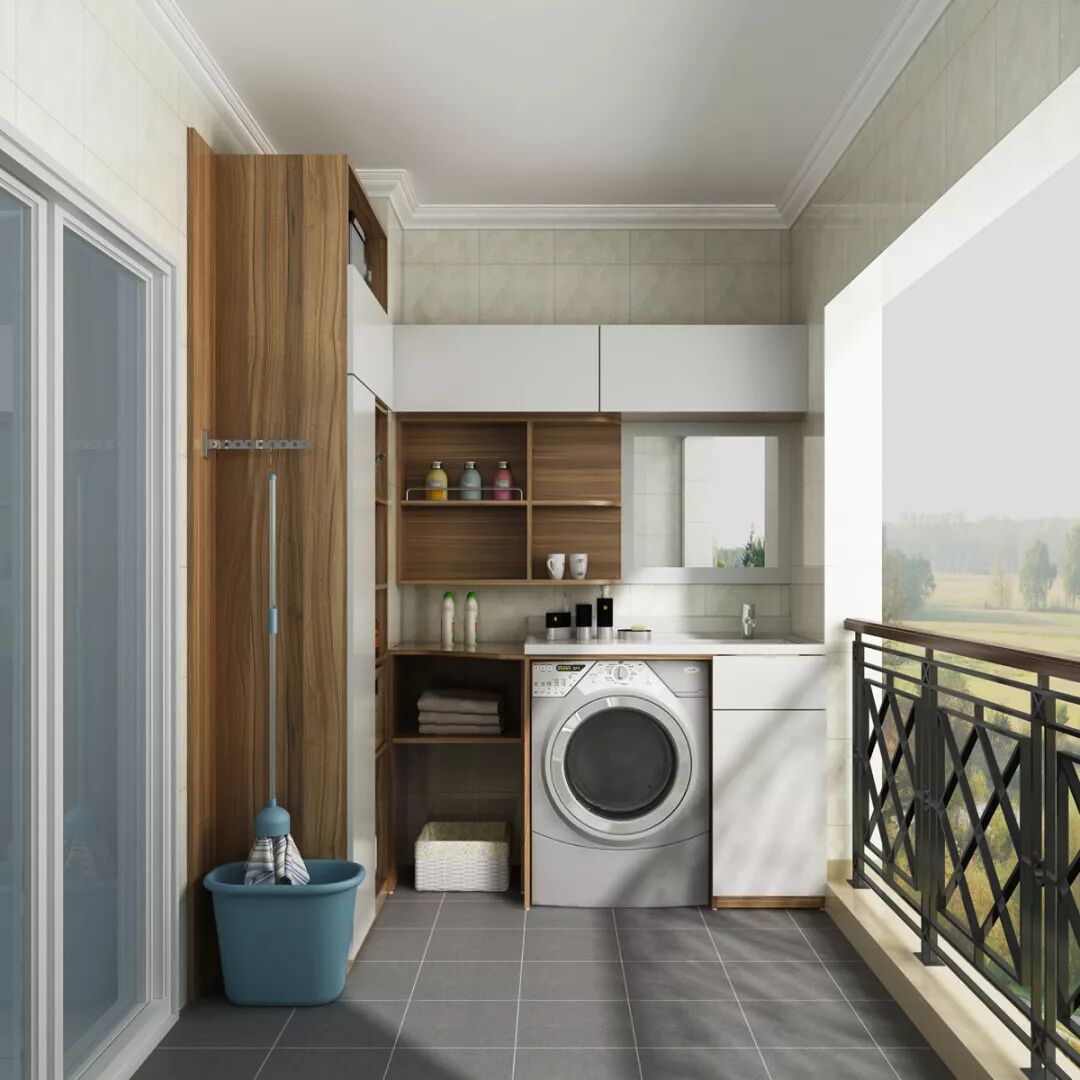 阳台可以改造成花园、鱼池、书房、吧台等休闲空间,但其实最实用的是设置阳台柜,改成洗衣房和家务空间,放置洗衣机、洗涤用品、拖地桶、扫把等。