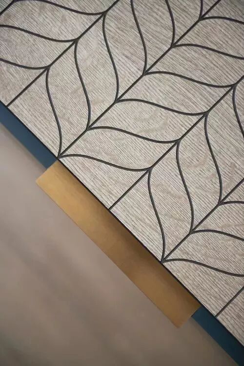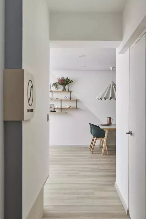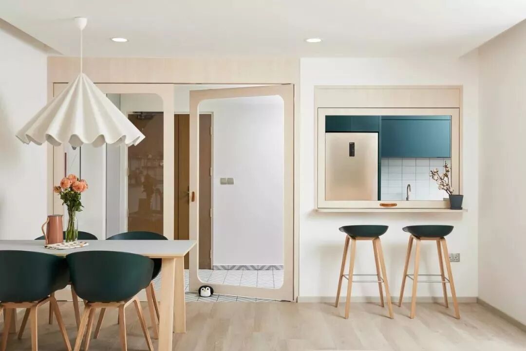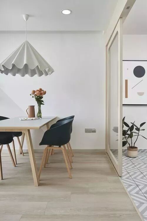 从大门进来,以一道浅木调玻璃门划分玄关与餐厅,界定室内外关系。门扇内框以圆弧收边,让空间多了一份活泼俏皮。